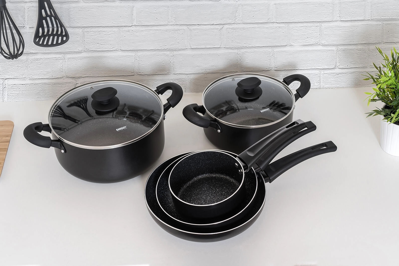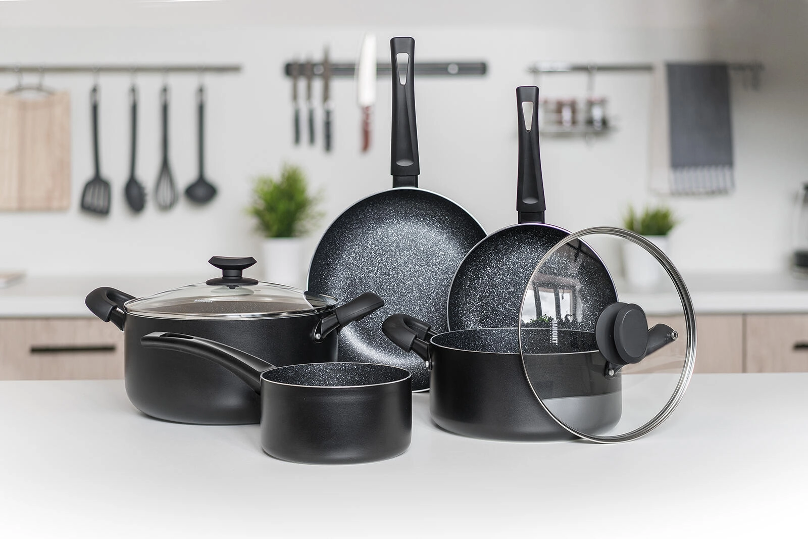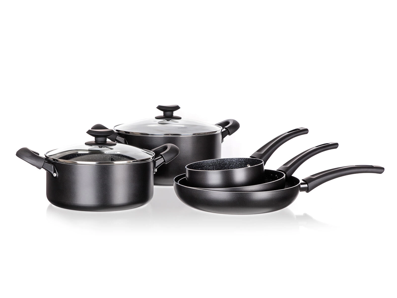 Batterie de cuisine universelle 7 pièces pour tous les jours, combinant un revêtement antiadhésif résistant, un fond entièrement compatible induction et des poignées ergonomiques soft touch. L’aluminium coulé assure une répartition rapide de la chaleur; les ustensiles sont résistants aux rayures, aux chocs et à la déformation, et grâce aux couvercles en verre transparent, vous gardez toujours la cuisson sous contrôle.