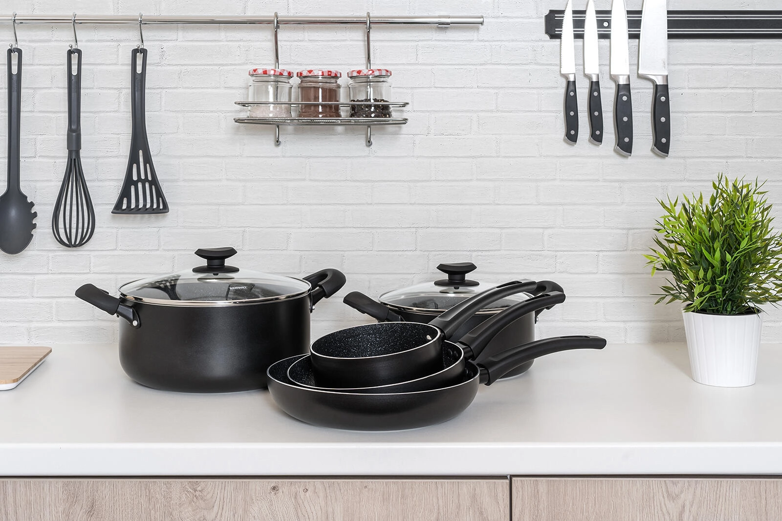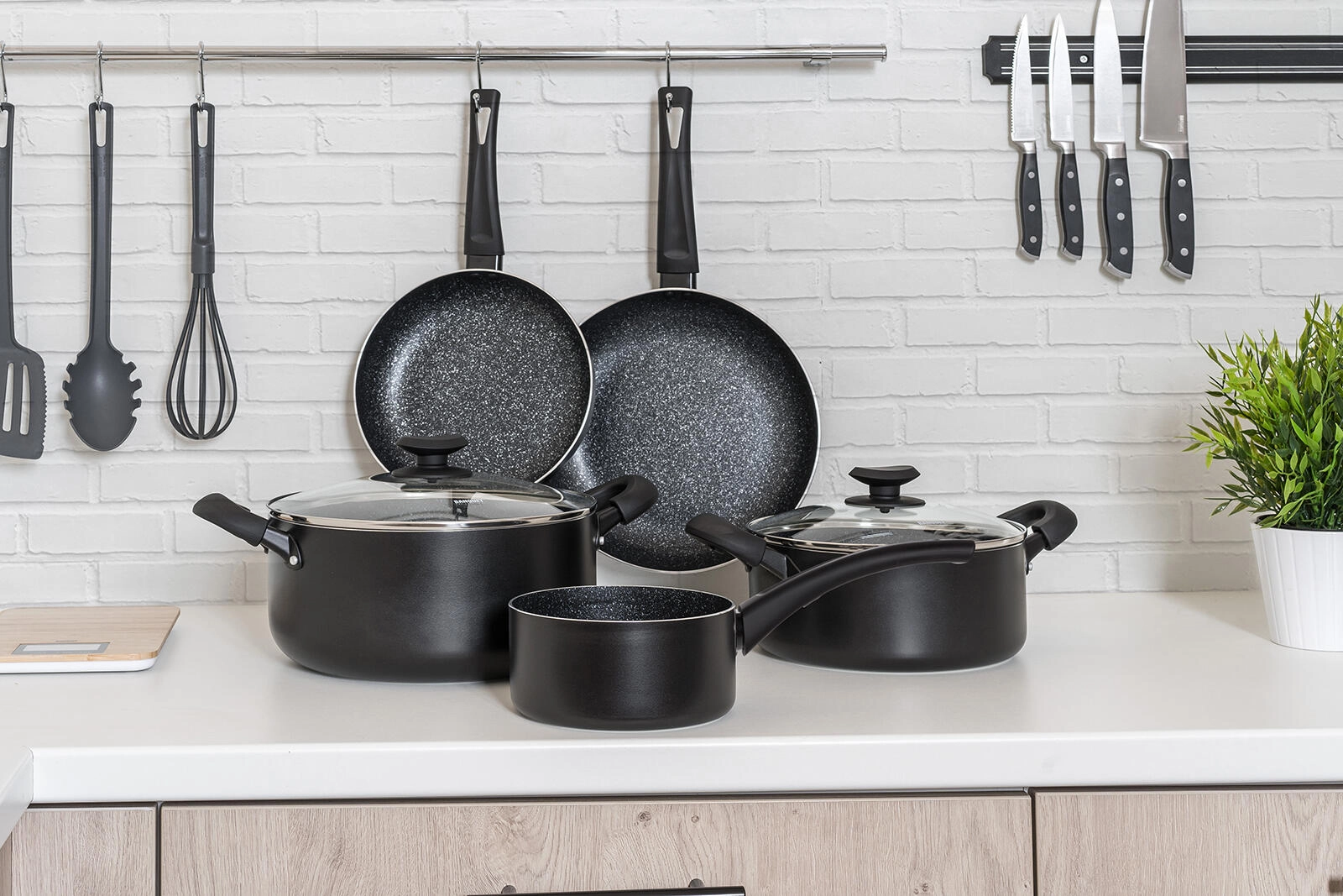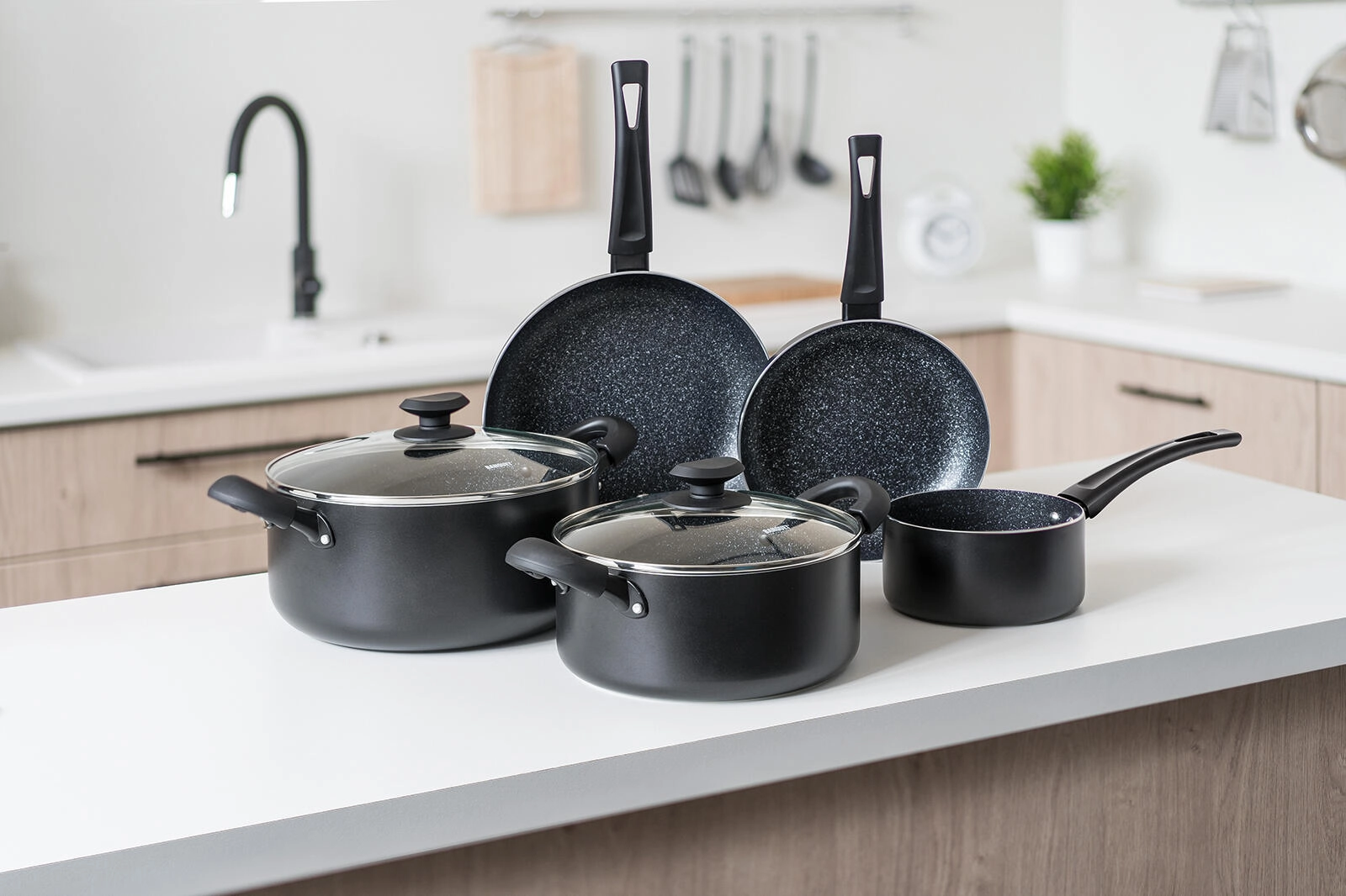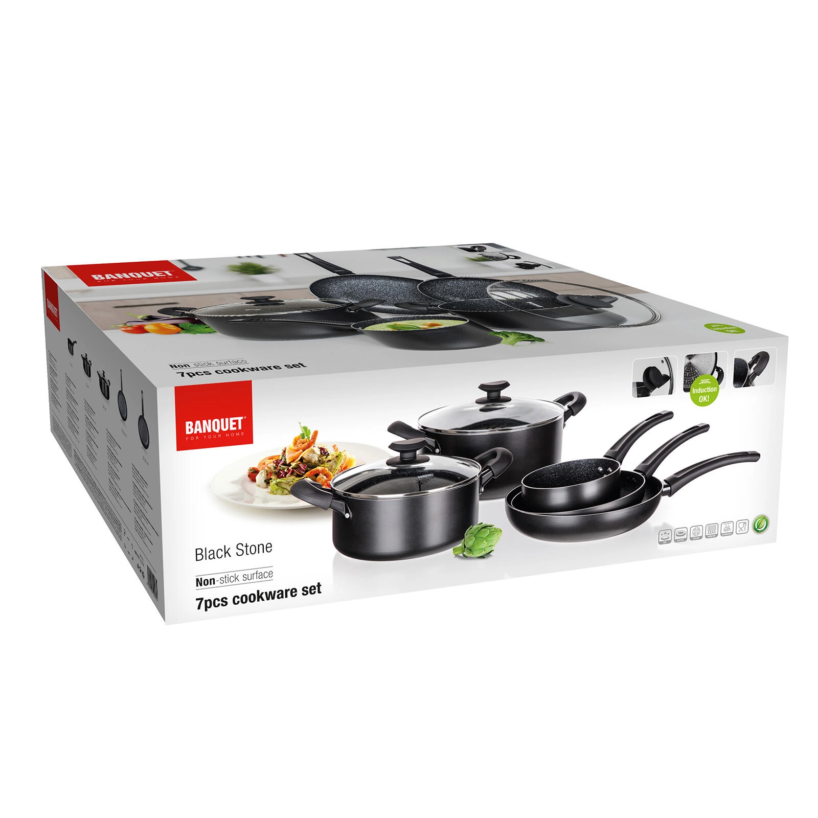 Batterie de cuisine universelle 7 pièces pour tous les jours, combinant un revêtement antiadhésif résistant, un fond entièrement compatible induction et des poignées ergonomiques soft touch. L’aluminium coulé assure une répartition rapide de la chaleur; les ustensiles sont résistants aux rayures, aux chocs et à la déformation, et grâce aux couvercles en verre transparent, vous gardez toujours la cuisson sous contrôle.