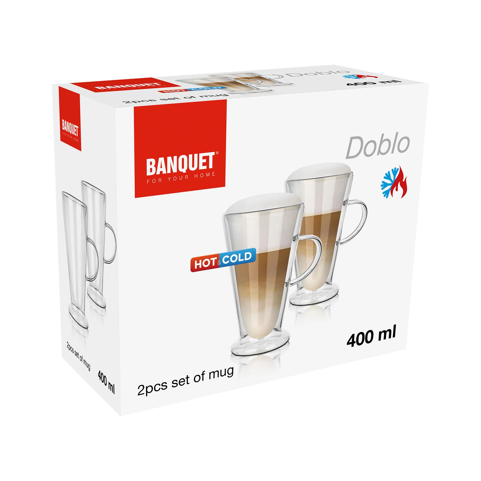 Élégantes tasses DOBLO à double paroi de 400 ml, idéales pour les amateurs de café comme de thé. Grâce au verre à double paroi isolant, la boisson reste plus longtemps chaude ou froide tandis que la paroi extérieure demeure agréablement fraîche. Leur grande capacité de 400 ml, leur anse confortable et la possibilité de lavage au lave-vaisselle en font un choix parfait pour un usage quotidien.