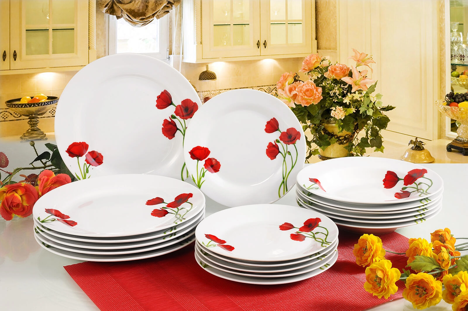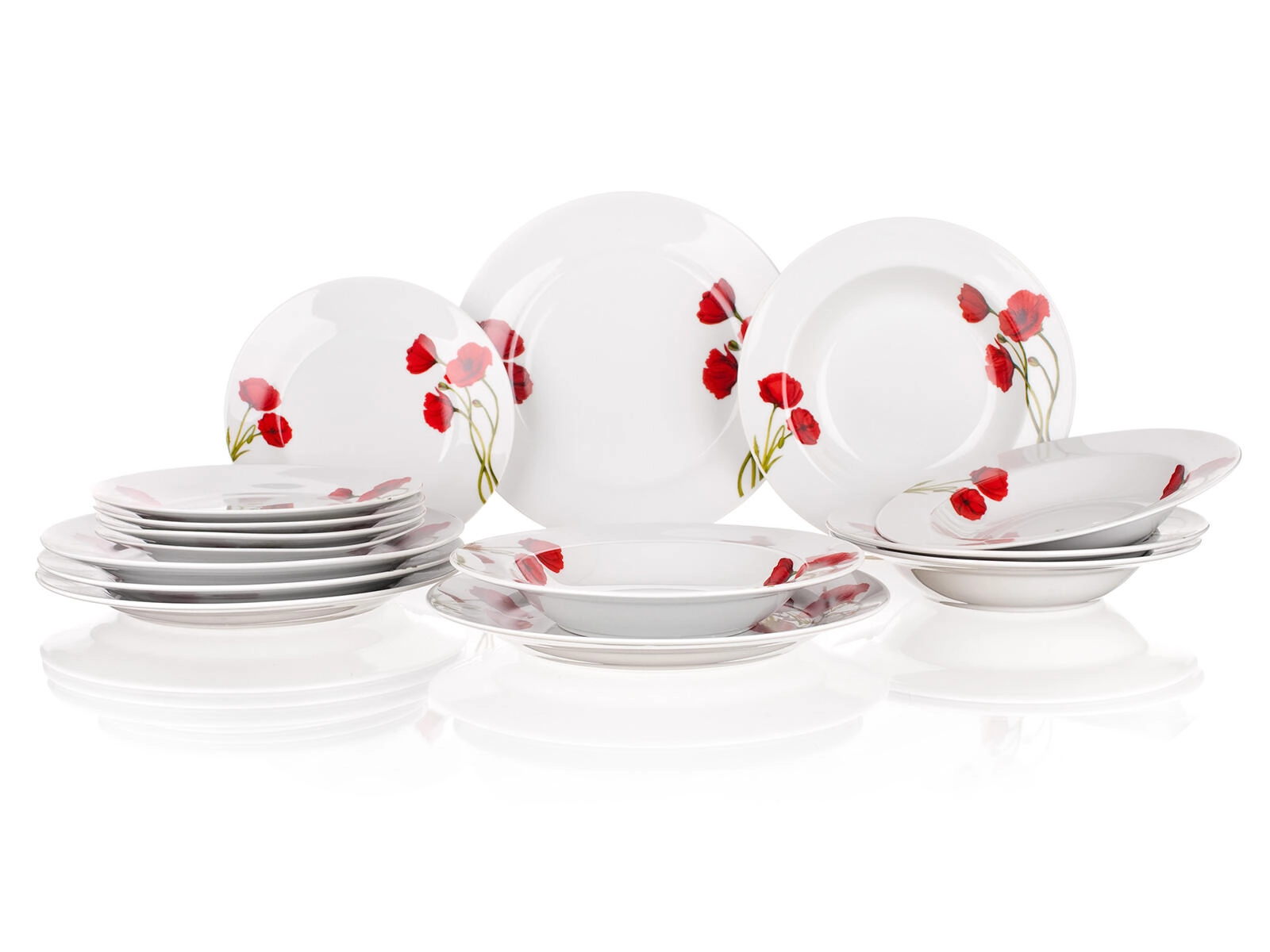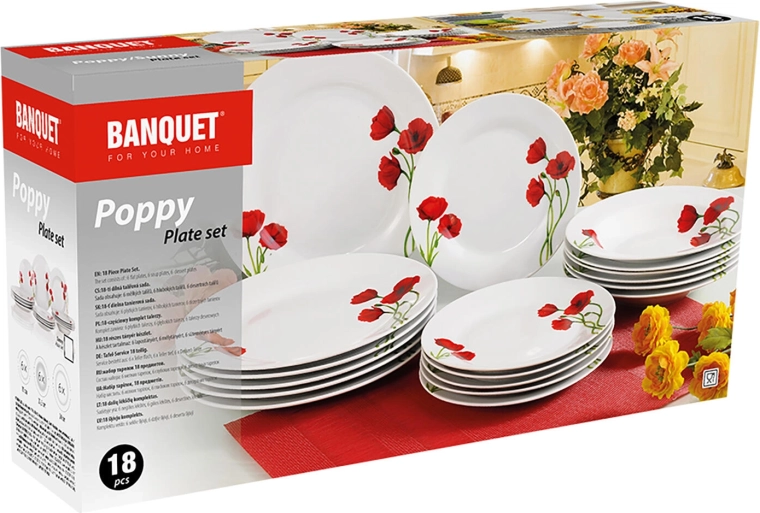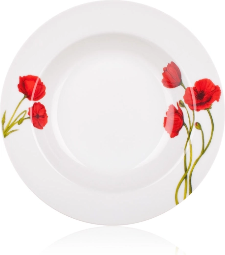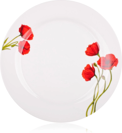 Élégant service de table en porcelaine POPPY de 18 pièces avec décor de coquelicots qui apporte un charme frais à chaque repas. Il comprend des assiettes à dessert, plates et creuses pour un service complet. Grâce à sa surface émaillée brillante, il se nettoie facilement, est compatible lave-vaisselle et adapté au four à micro-ondes.