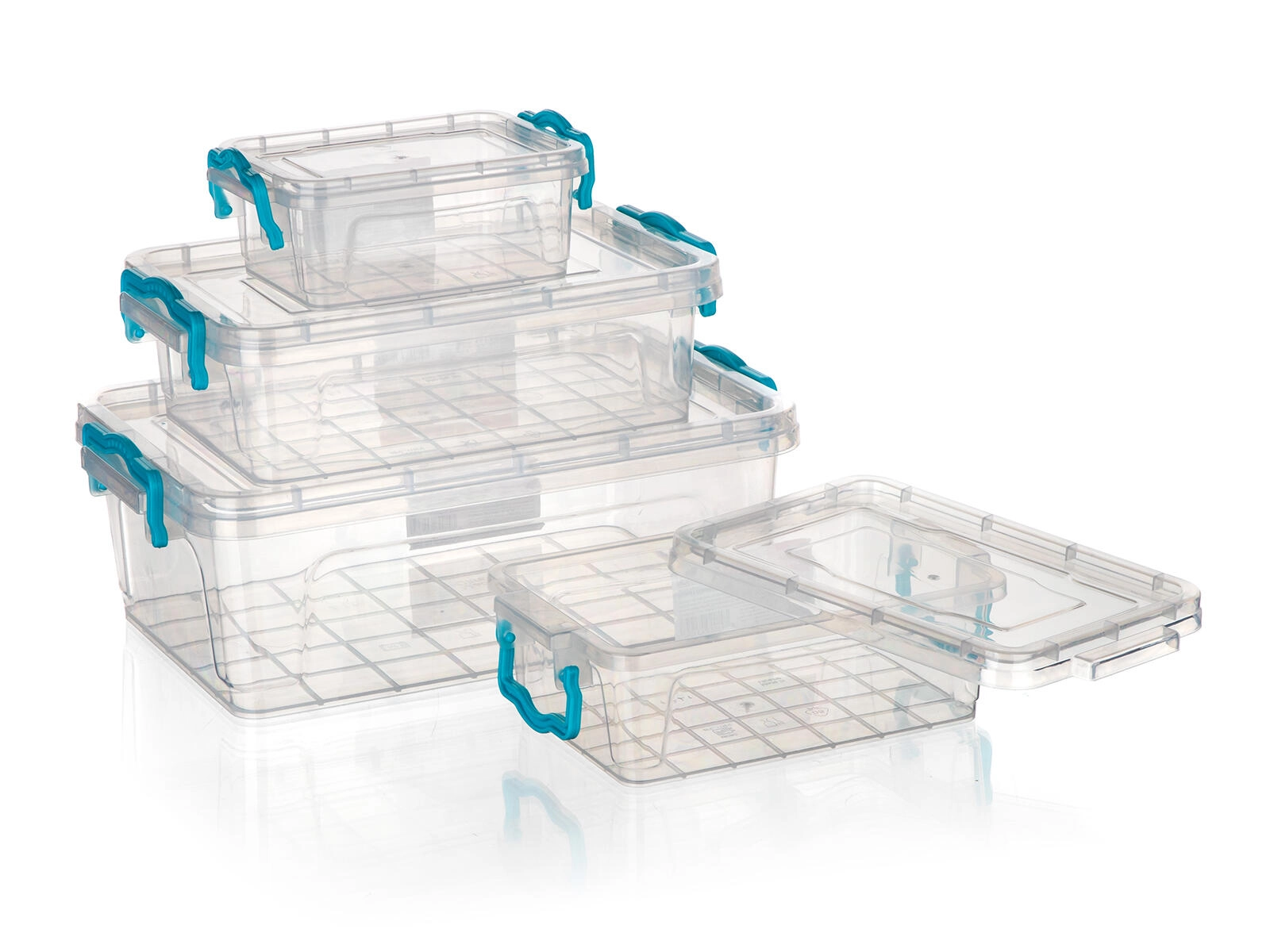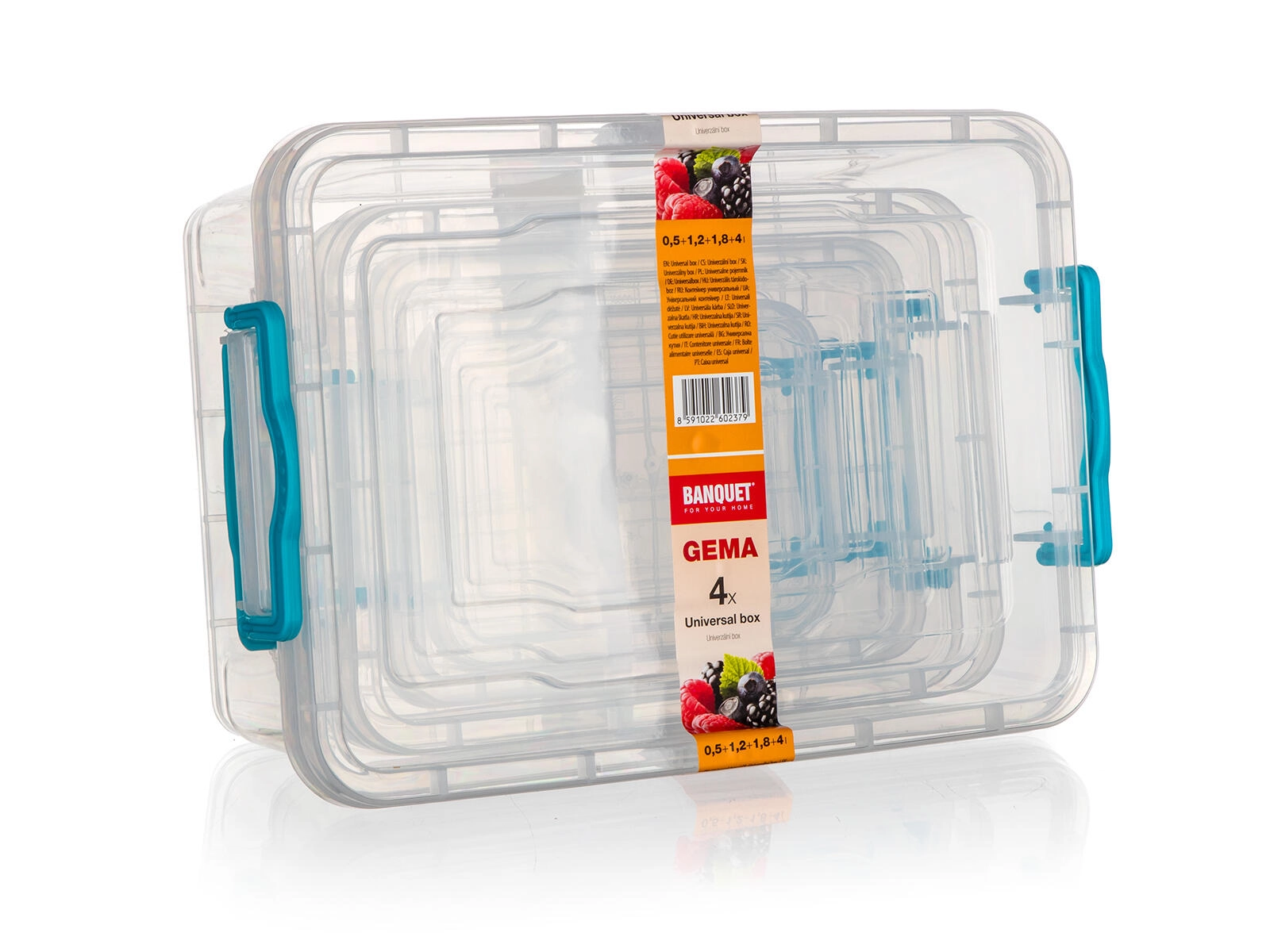 Le set GEMA comprend quatre boîtes en plastique polyvalentes de 0,5 l, 1,2 l, 1,8 l et 4 l. Grâce aux parois transparentes, vous voyez toujours le contenu en un coup d’œil, tandis que les poignées à clips turquoise maintiennent le couvercle fermement en place pendant le stockage et le transport.