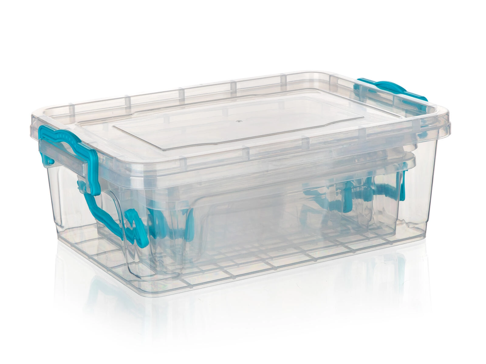 Les clips turquoise maintiennent le couvercle en toute fiabilité lors du stockage et du transport. Le contenu reste en sécurité.