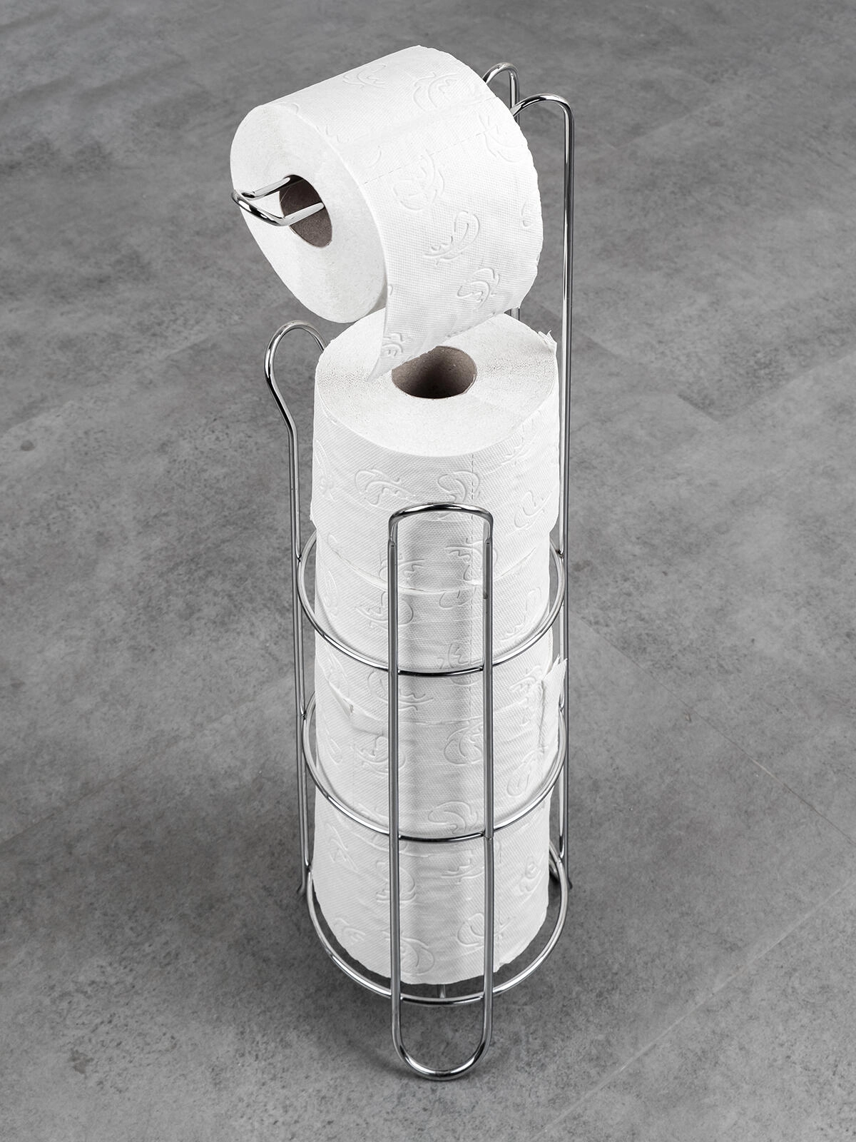 La structure filaire verticale accueille 3 rouleaux de rechange, et un autre rouleau se place aisément sur le bras supérieur pour une utilisation immédiate.