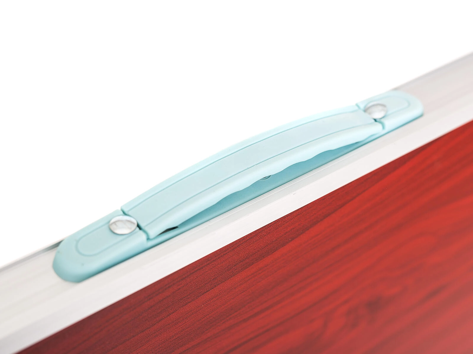 La surface stratifiée se nettoie facilement et les baguettes en aluminium aux angles arrondis protègent le plateau des chocs et des rayures.