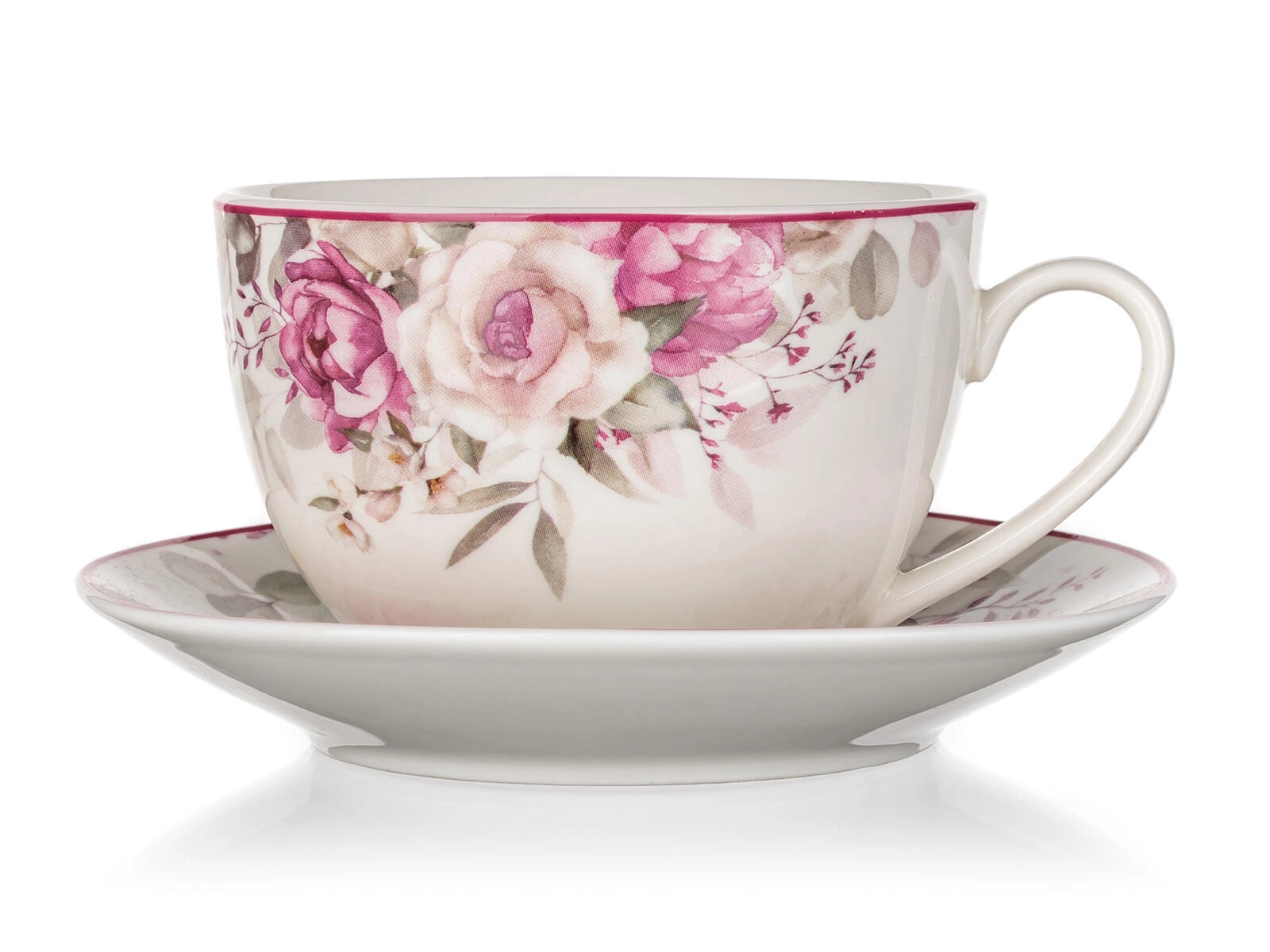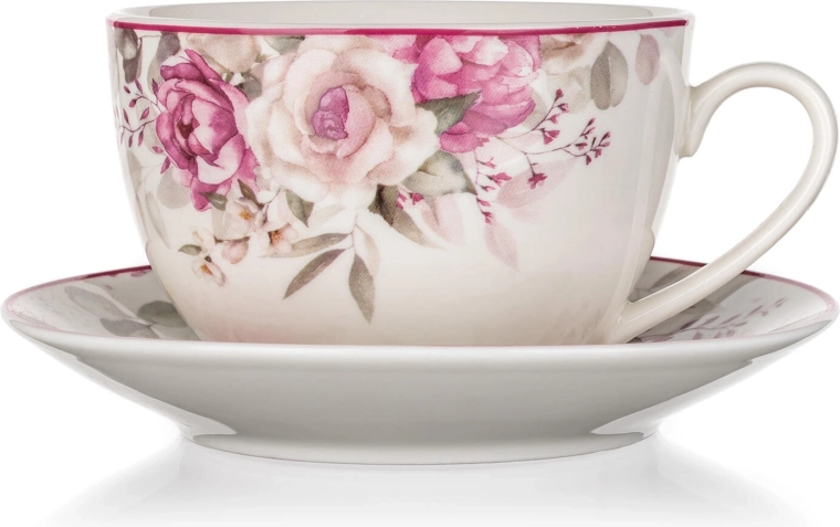 La tasse avec soucoupe ROSE se distingue par son délicat décor floral dans des tons rosés, qui embellira toute table dressée. Sa capacité de 240 ml est idéale pour un cappuccino, un thé noir ou aux herbes, ou un chocolat chaud. La céramique de qualité conserve la température de la boisson et offre une prise en main agréable.