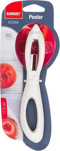 Découvrez l’alliance de la performance et du confort : l’épluche-légumes ACCASA à lame inox pénètre aisément la peau et gère même les surfaces plus tendres comme celles des tomates ou des pêches. Sa poignée en plastique robuste, dans une élégante teinte crème, assure une prise ferme et un confort optimal au quotidien.