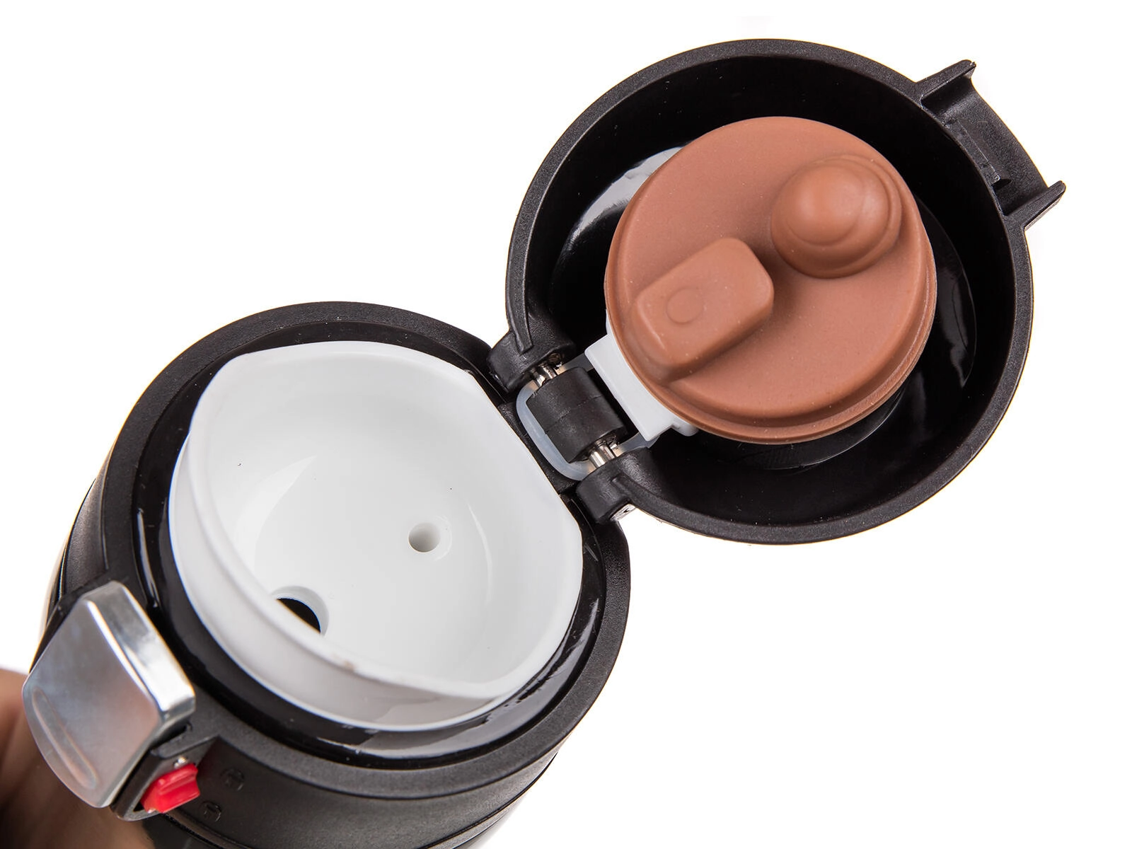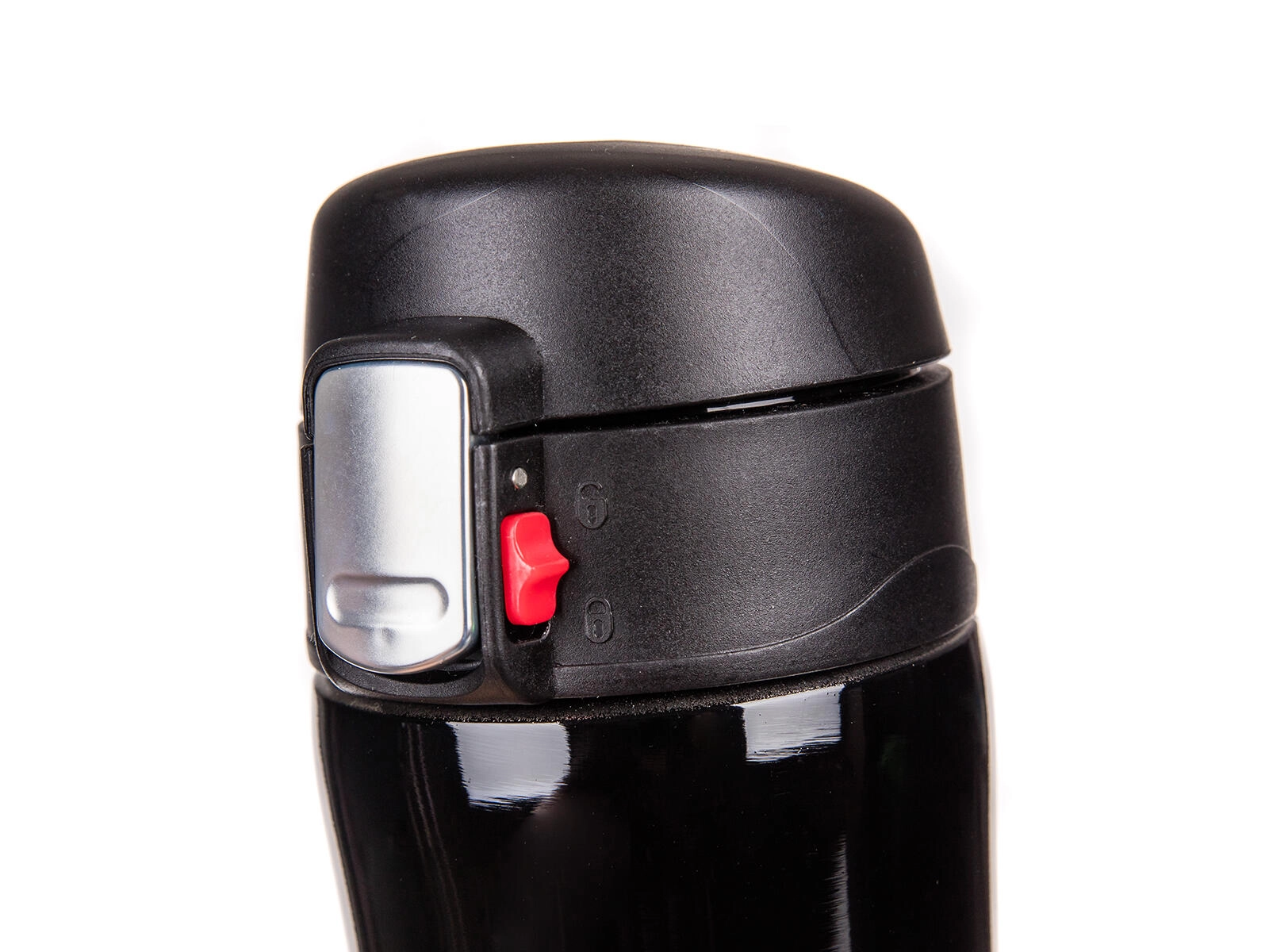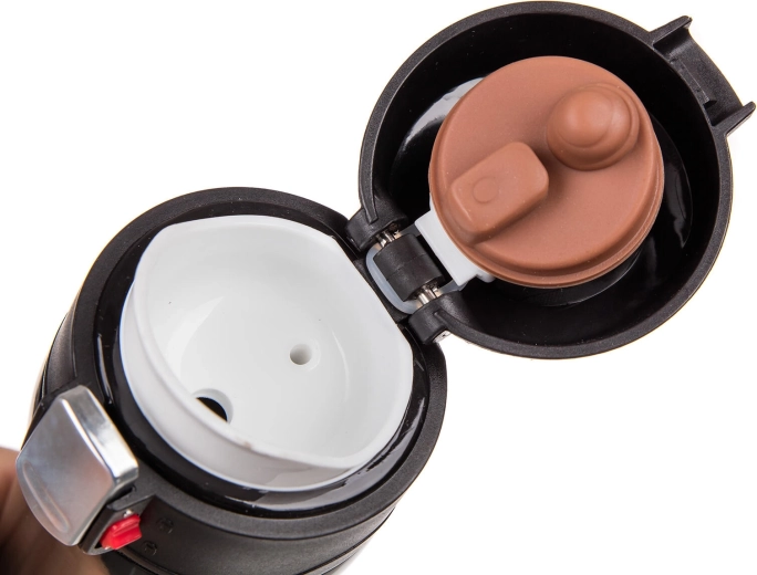 Le couvercle flip‑top s’ouvre par simple pression sur un bouton et est sécurisé par un verrou coulissant empêchant toute ouverture accidentelle dans un sac ou un sac à dos.