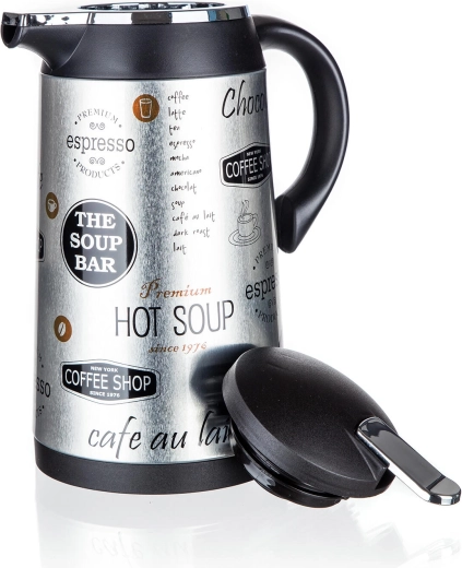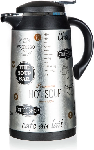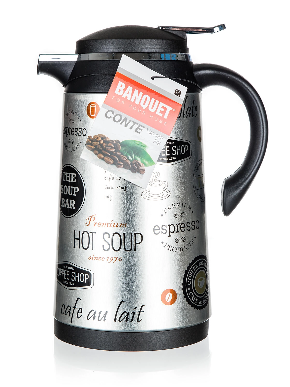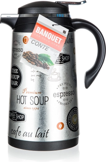 La carafe isotherme CONTE allie praticité et design moderne. Grâce à son ampoule isolante en verre, le café, le thé ou les limonades froides conservent leur température longtemps. Son revêtement en acier inoxydable avec imprimé décoratif apporte robustesse et élégance, tandis que la poignée ergonomique en plastique PP garantit un service confortable et sûr.