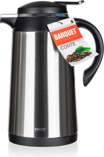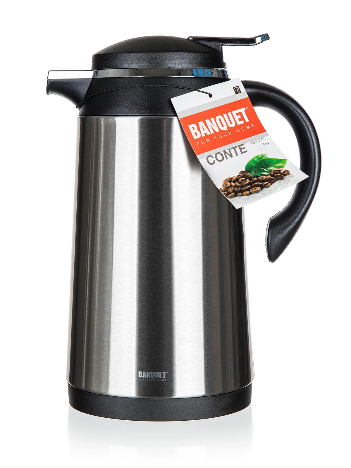 La thermocarafe BANQUET CONTE est idéale pour la maison, le bureau et les moments au jardin. Sa construction à double paroi avec ampoule en verre maintient parfaitement la température, tandis que l’enveloppe en inox avec finition de qualité apporte résistance et look moderne. Le mécanisme à levier du couvercle permet de verser confortablement d’une seule main sans goutter.