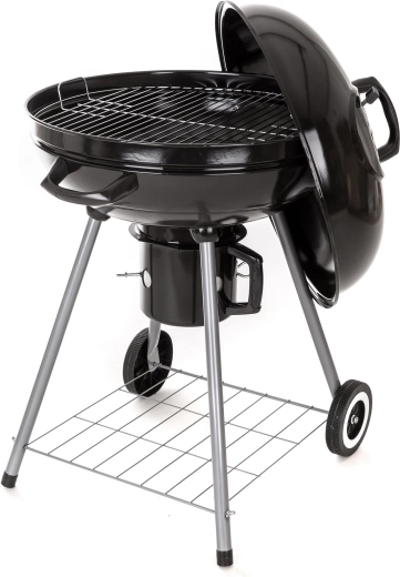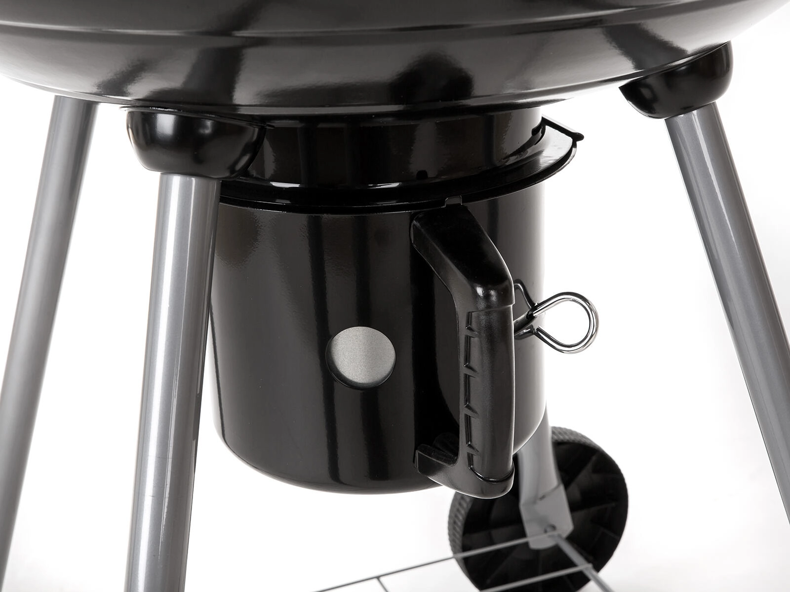 Le cendrier amovible facilite le nettoyage après la cuisson et les roulettes permettent de déplacer aisément le barbecue sur la terrasse ou dans le jardin. La construction stable avec pieds en acier inoxydable et grille à charbon galvanisée garantit durabilité et sécurité d’utilisation.
