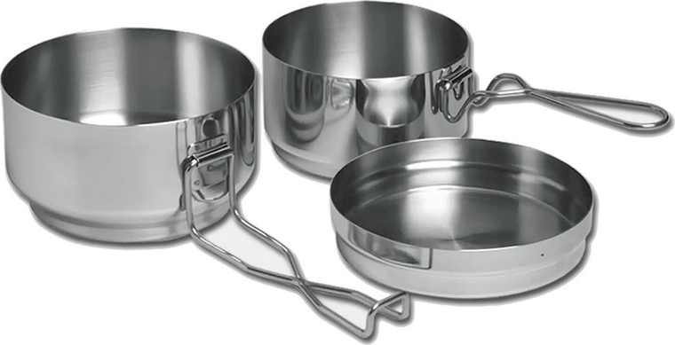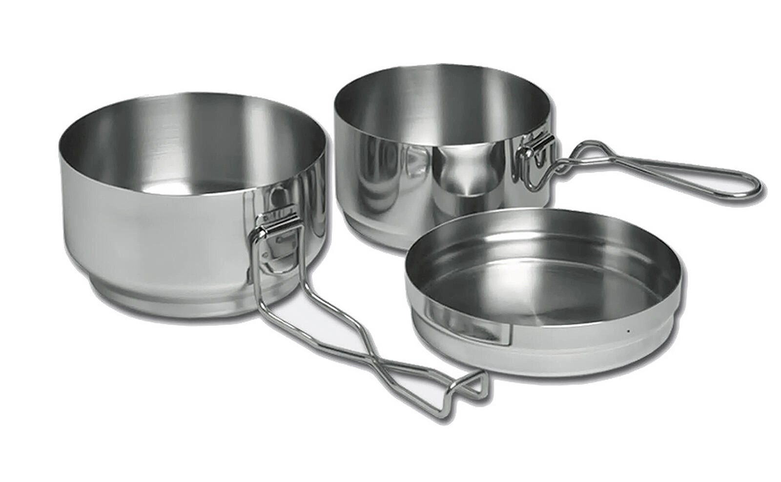 Deux récipients en acier inoxydable (1,4 l et 1 l) et un couvercle couvrent la cuisson, le réchauffage et le service. Le tout s’emboîte facilement et économise de la place dans le sac à dos.