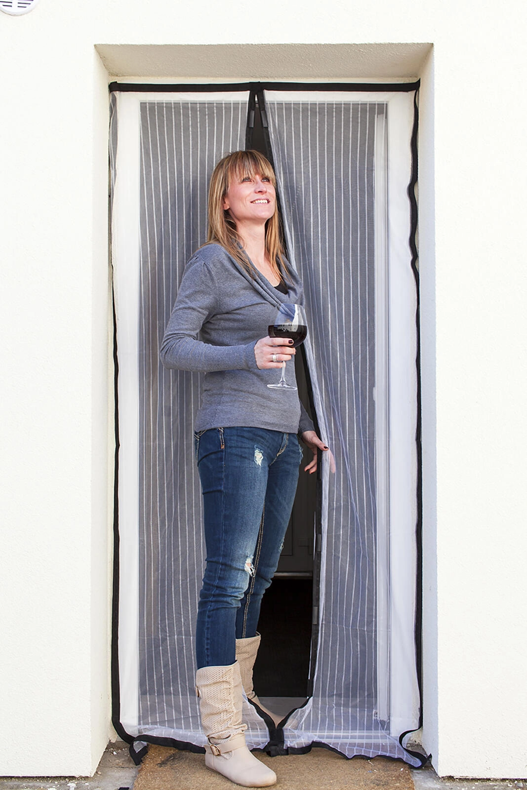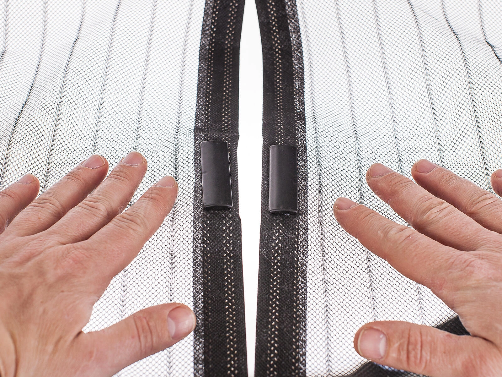 Les deux panneaux de la moustiquaire se rejoignent d’eux-mêmes après le passage. De puissants aimants sur toute la hauteur garantissent que les insectes restent dehors tandis que l’air circule à l’intérieur.