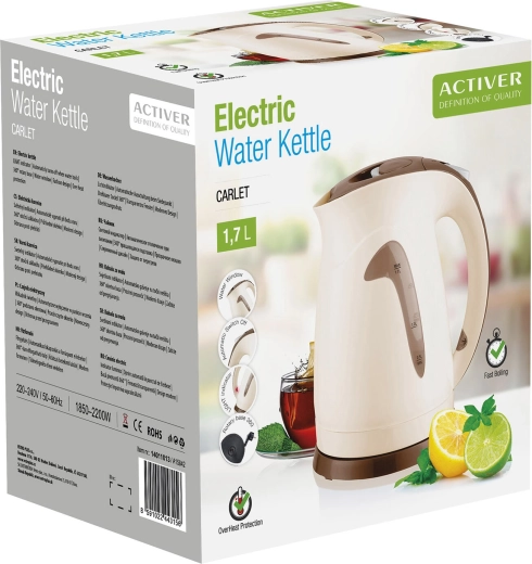 Élégante bouilloire électrique Carlet d’une capacité de 1,7 l en finition beige‑brun, offrant une puissance jusqu’à 2200 W pour un chauffage rapide de l’eau. Elle dispose d’un fond plat en inox, d’un indicateur de niveau transparent, d’une base rotative à 360°, d’une protection contre la surchauffe et d’un arrêt automatique avec indicateur lumineux.