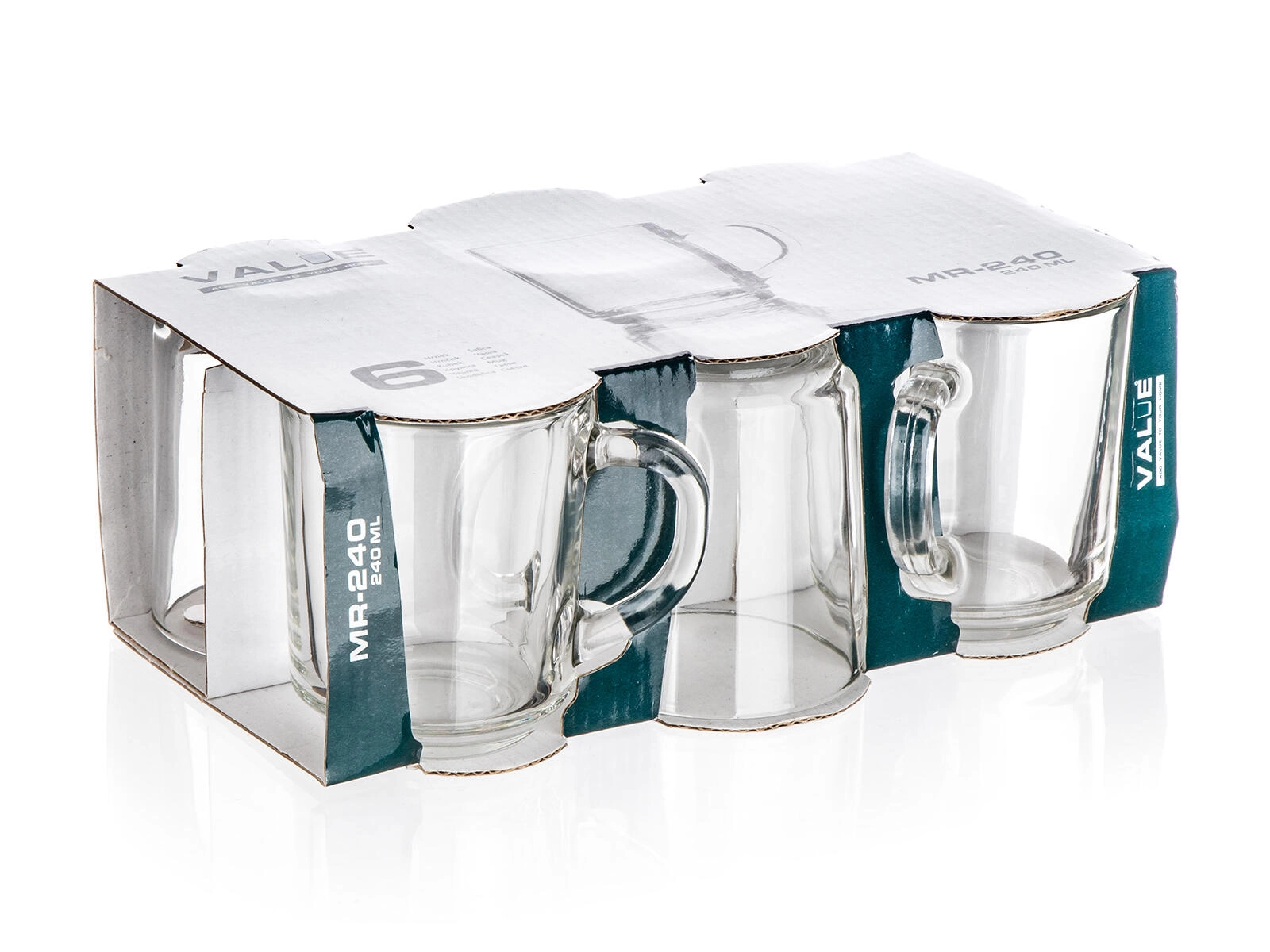 Pratique lot de six mugs en verre de 240 ml, idéal pour un usage quotidien. Grâce au verre résistant, à l’anse confortable et à la base plus épaisse et stable, ces mugs conviennent aux boissons chaudes et froides. Le design simple et intemporel VALUE s’intègre à toutes les cuisines et bureaux.