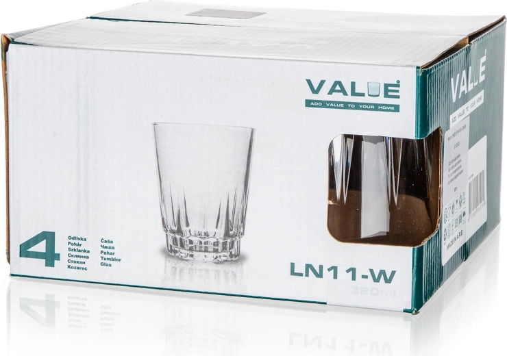 Élégant set de quatre verres VALUE d’une capacité de 300 ml pour un usage quotidien comme pour les moments festifs. Des verres avec un fond épais et résistant, un design facetté et une prise en main confortable, parfaits pour l’eau, le jus ou le whisky. Livrés dans un emballage cadeau décoratif.