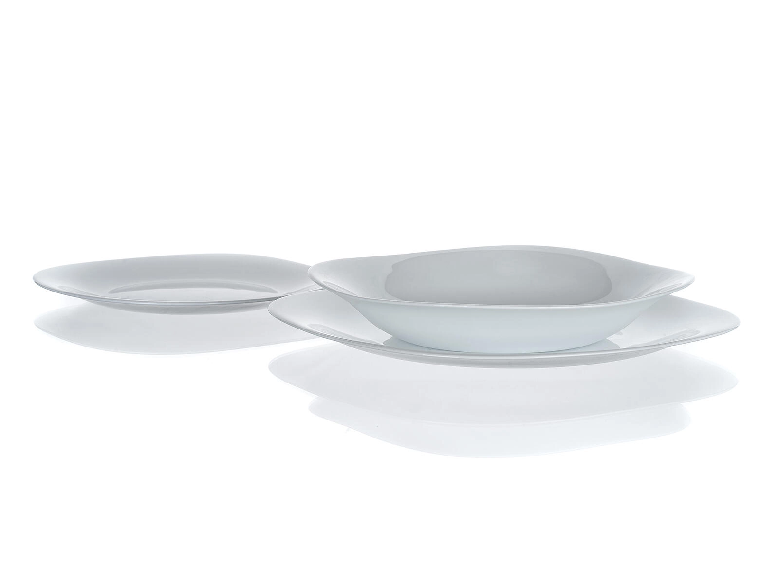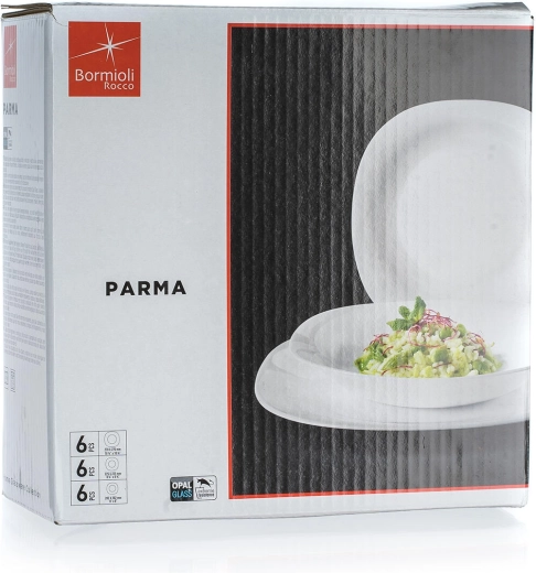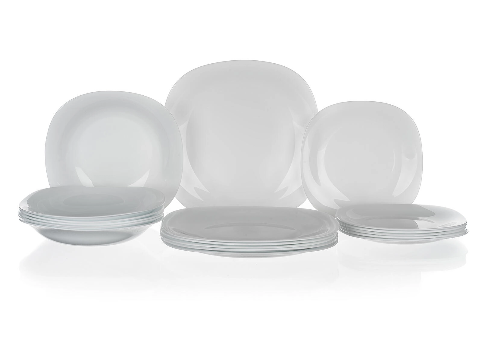 Ce service PARMA de 18 pièces en blanc allie look minimaliste et praticité maximale. La forme carrée aux angles légèrement arrondis apporte une touche moderne à votre table et se marie facilement avec d’autres vaisselles. Le verre de qualité garantit une longue durée de vie et un entretien facile.