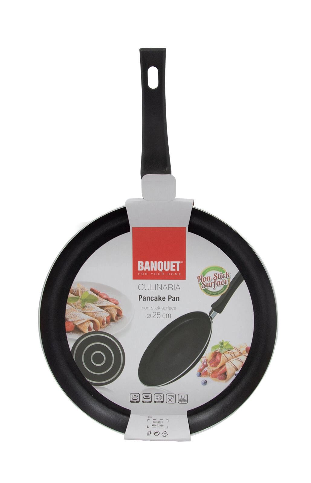 Poêle à crêpes légère et pratique de 25 cm de diamètre de la gamme Culinaria avec revêtement antiadhésif XYLAN à deux couches pour un retournement facile et une utilisation minimale d’huile. Elle possède une poignée ergonomique en bakélite fixée par rivets et convient à tous les types de plaques sauf l’induction.