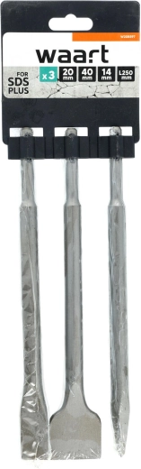 Jeu universel de burins avec emmanchement SDS‑Plus pour marteaux perforateurs, qui facilite les travaux tels que burinage, démolition, rainurage et bris de maçonnerie, béton, carreaux, dalles et pierre. Comprend deux burins plats 20/40 × 250 mm et un burin pointu 14 × 250 mm.