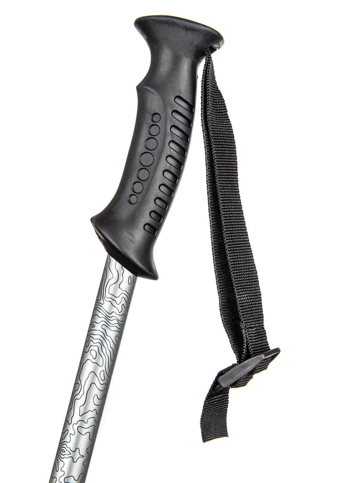 Poignée ergonomique en caoutchouc avec dragonne réglable et confortable rallonge en mousse pour un maintien stable, même lors de longues randonnées et des changements de pente.