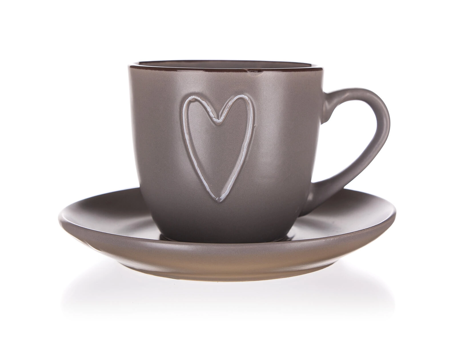 Élégante tasse avec soucoupe d’une capacité de 260 ml, de couleur marron, avec un décor cœur, en céramique de qualité. Adaptée à un usage quotidien, passe au lave-vaisselle et au micro-ondes.