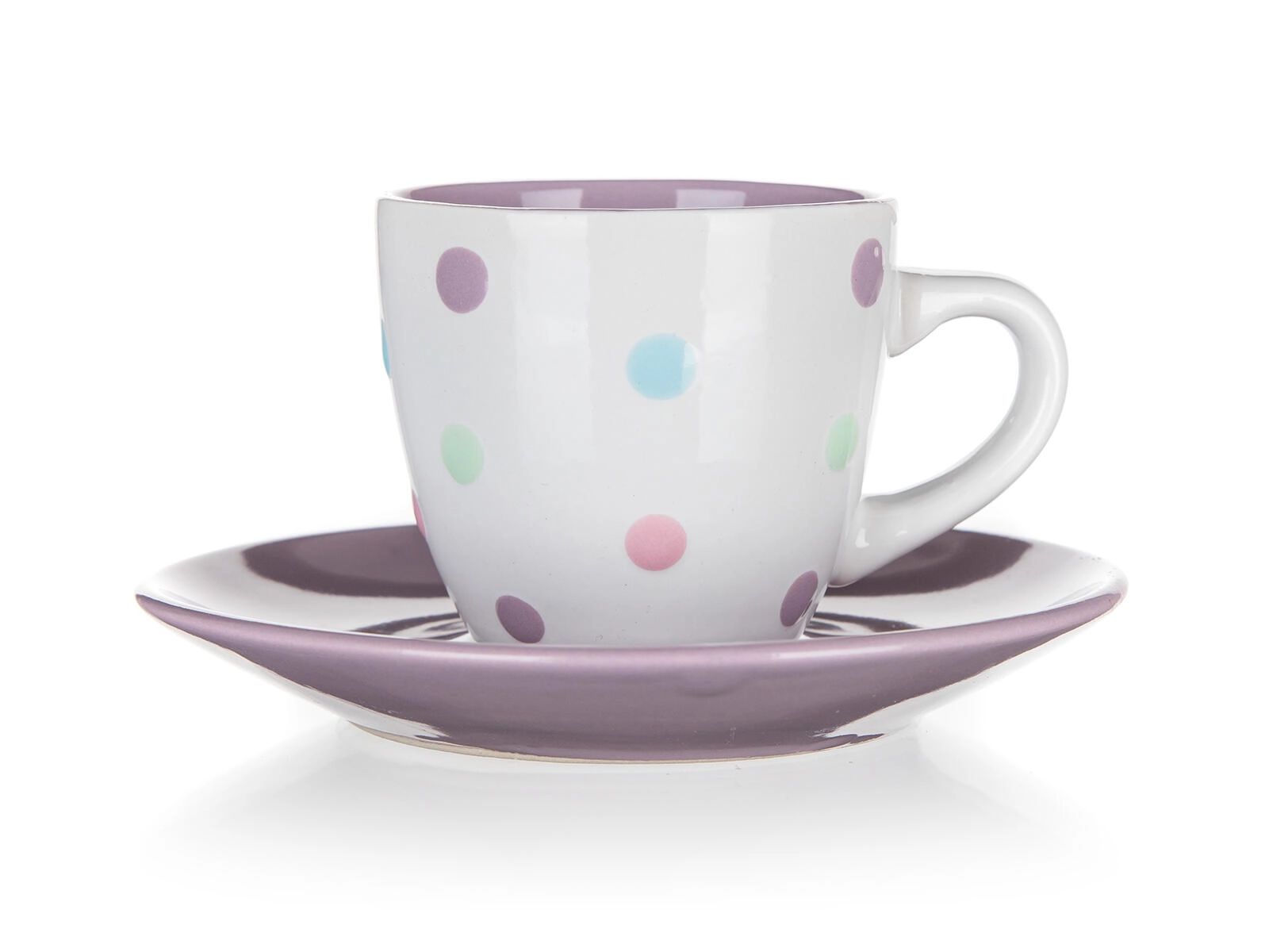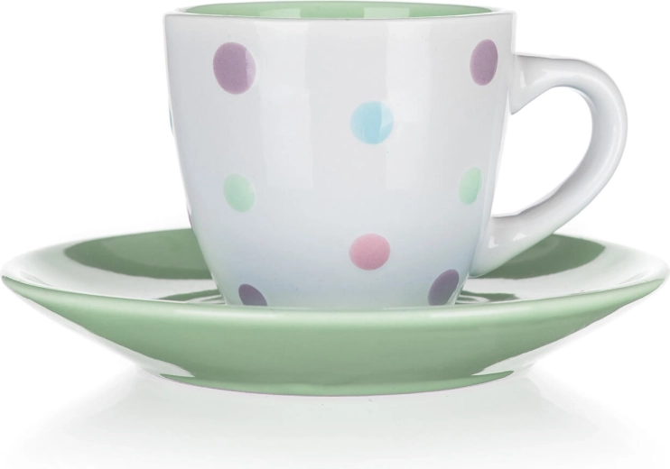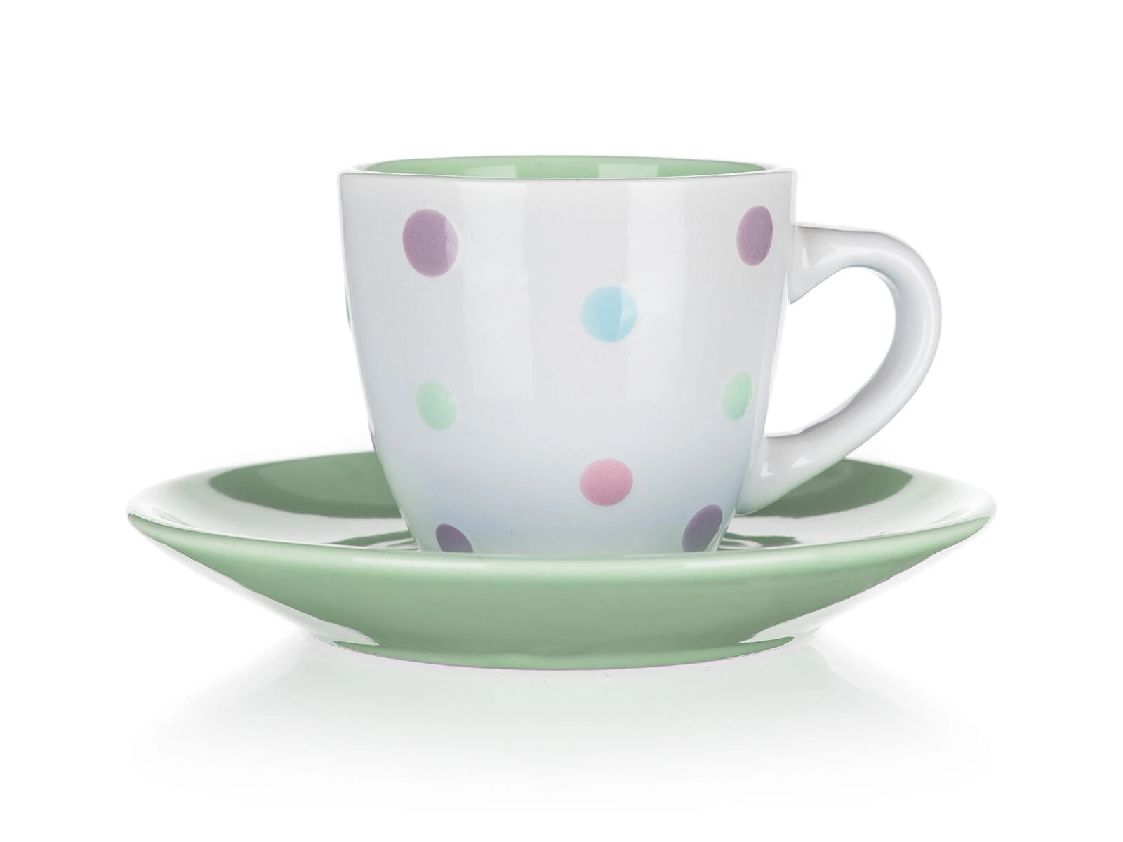 La combinaison d’une tasse blanche à pois multicolores et d’une soucoupe assortie illuminera chaque rituel café et s’intègrera aussi bien dans une cuisine moderne que vintage.