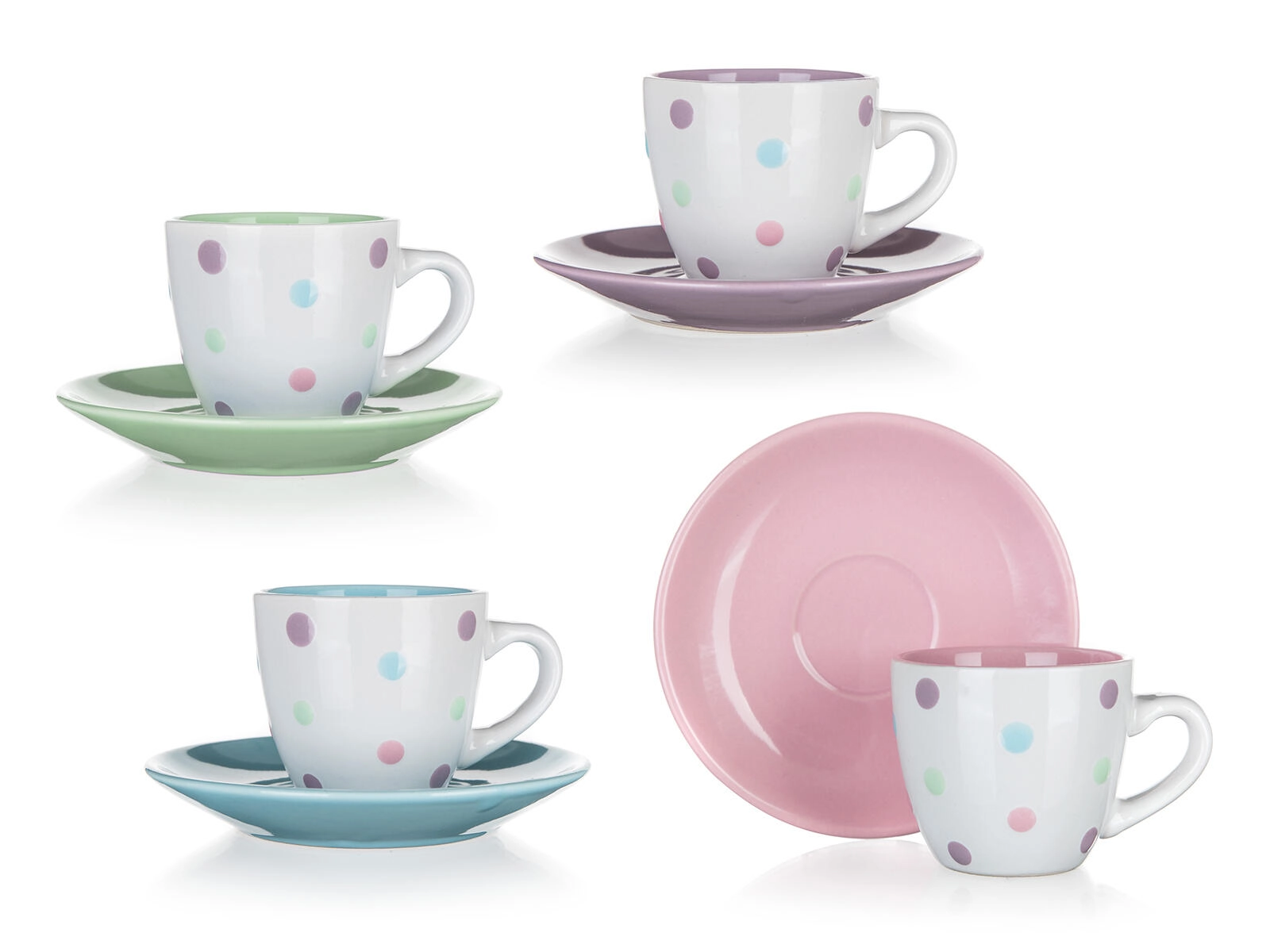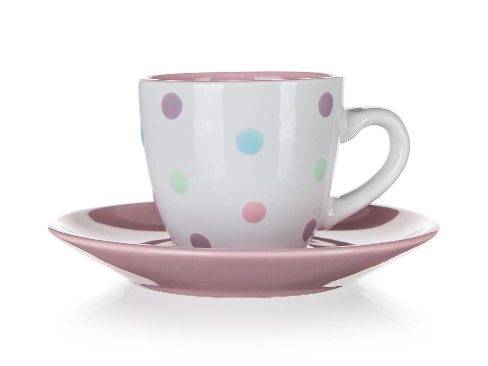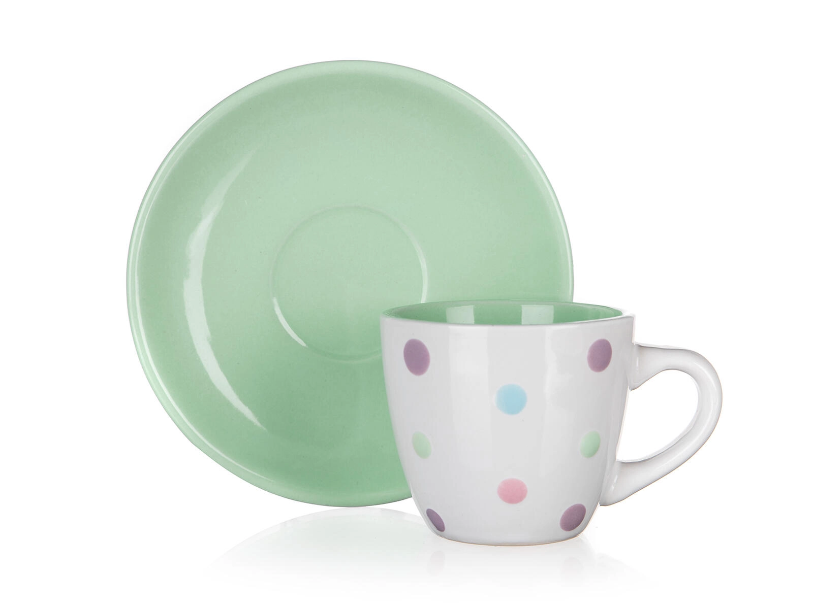La combinaison d’une tasse blanche à pois multicolores et d’une soucoupe assortie illuminera chaque rituel café et s’intègrera aussi bien dans une cuisine moderne que vintage.