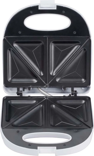 Gaufrier à sandwichs pratique pour 2 portions, idéal pour préparer rapidement des toasts triangulaires croustillants. Il offre un revêtement antiadhésif pour un nettoyage facile, une régulation automatique de la température pour une cuisson homogène et un indicateur lumineux pour une utilisation claire. Grâce à la poignée thermoisolée, la manipulation est sûre et confortable.