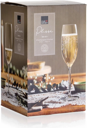 Verres à mousseux ROYAL LEERDAM Plissé d’une capacité de 210 ml en lot pratique de 4 pièces. La flûte haute et étroite préserve parfaitement les bulles et les arômes, tandis que la longue jambe permet une prise en main confortable sans réchauffer la boisson. Verre hollandais de qualité, bords trempés pour une meilleure résistance et design intemporel pour toutes les occasions.