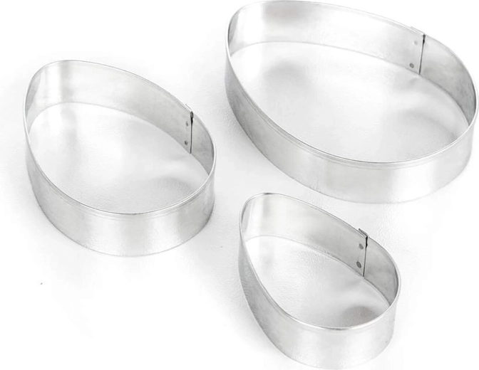 Le set comprend un petit (5,5 × 3,5 cm), un moyen (7 × 5 cm) et un grand (8,4 × 6,5 cm) œuf – idéal pour superposer, décorer et travailler différents types de pâtes.