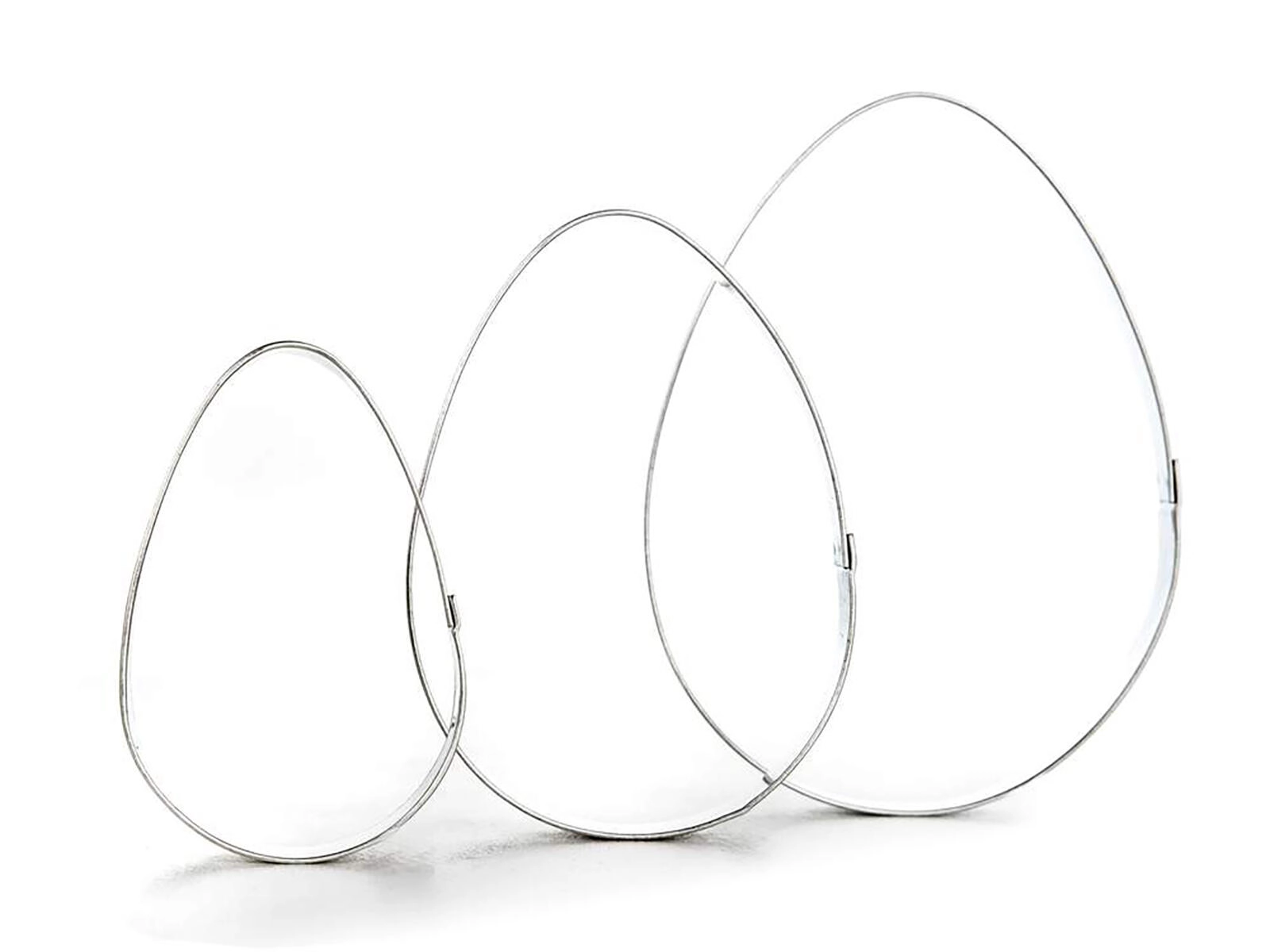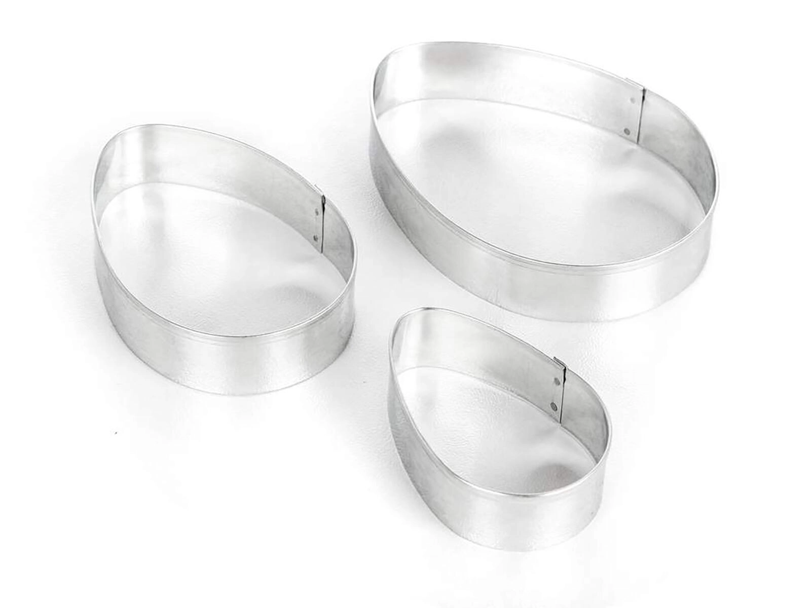 Pratique set de 3 emporte-pièces en forme d’œuf pour une pâtisserie de Pâques et de tous les jours en toute simplicité. La tôle étamée résistante assure une coupe nette et une longue durée de vie, tandis que trois tailles permettent des décorations créatives et le superposition des formes.