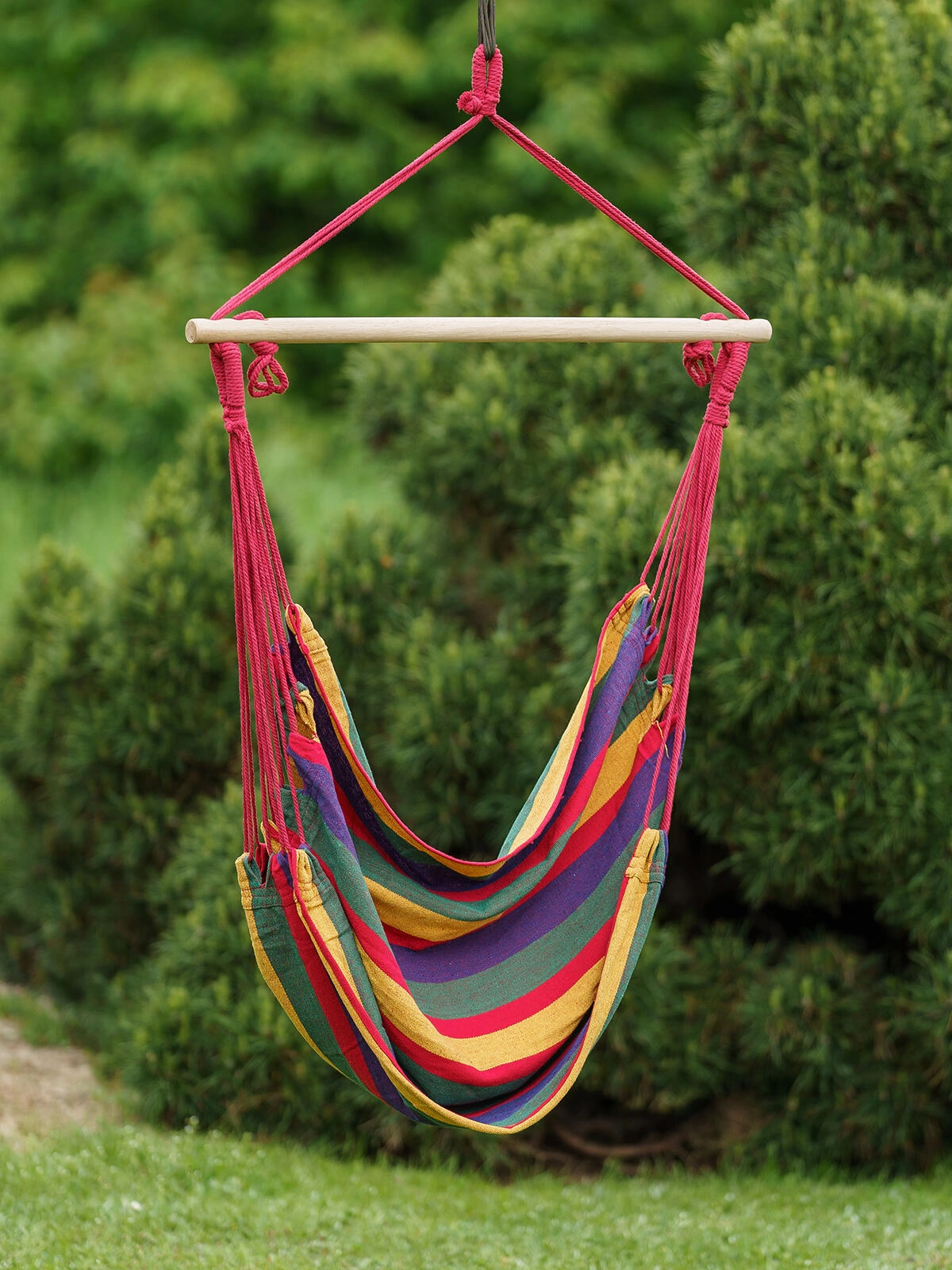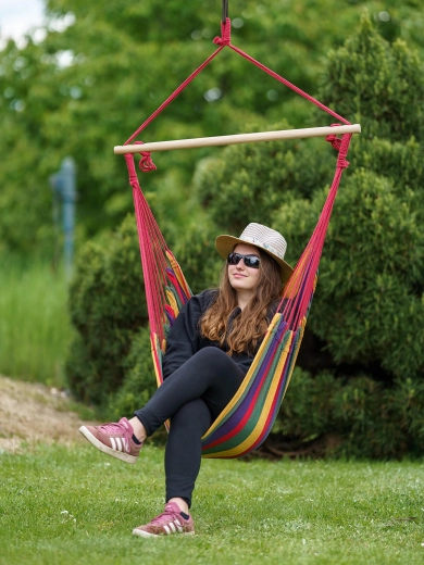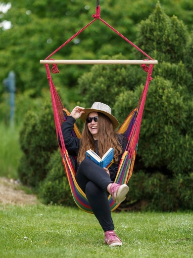 Ce fauteuil hamac suspendu apporte instantanément du bien-être à tout espace. Grâce à sa construction robuste et à son accrochage à point unique, il se monte facilement sur un crochet de plafond ou un support, tandis que la barre d’écartement en bois maintient l’assise largement ouverte pour un confort optimal.