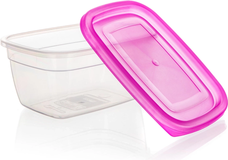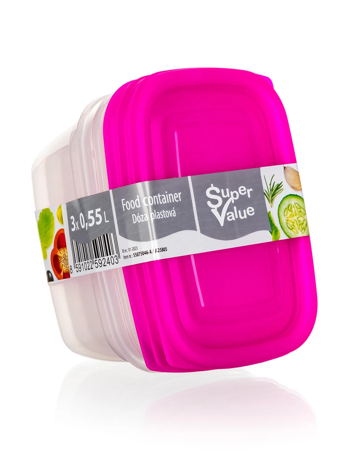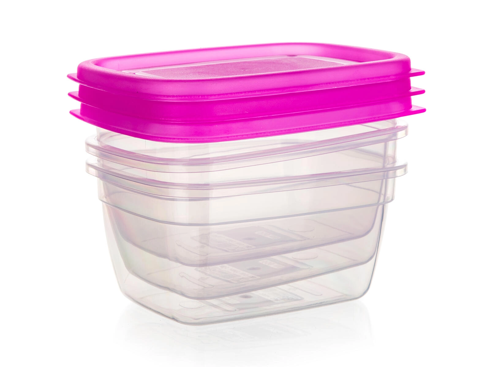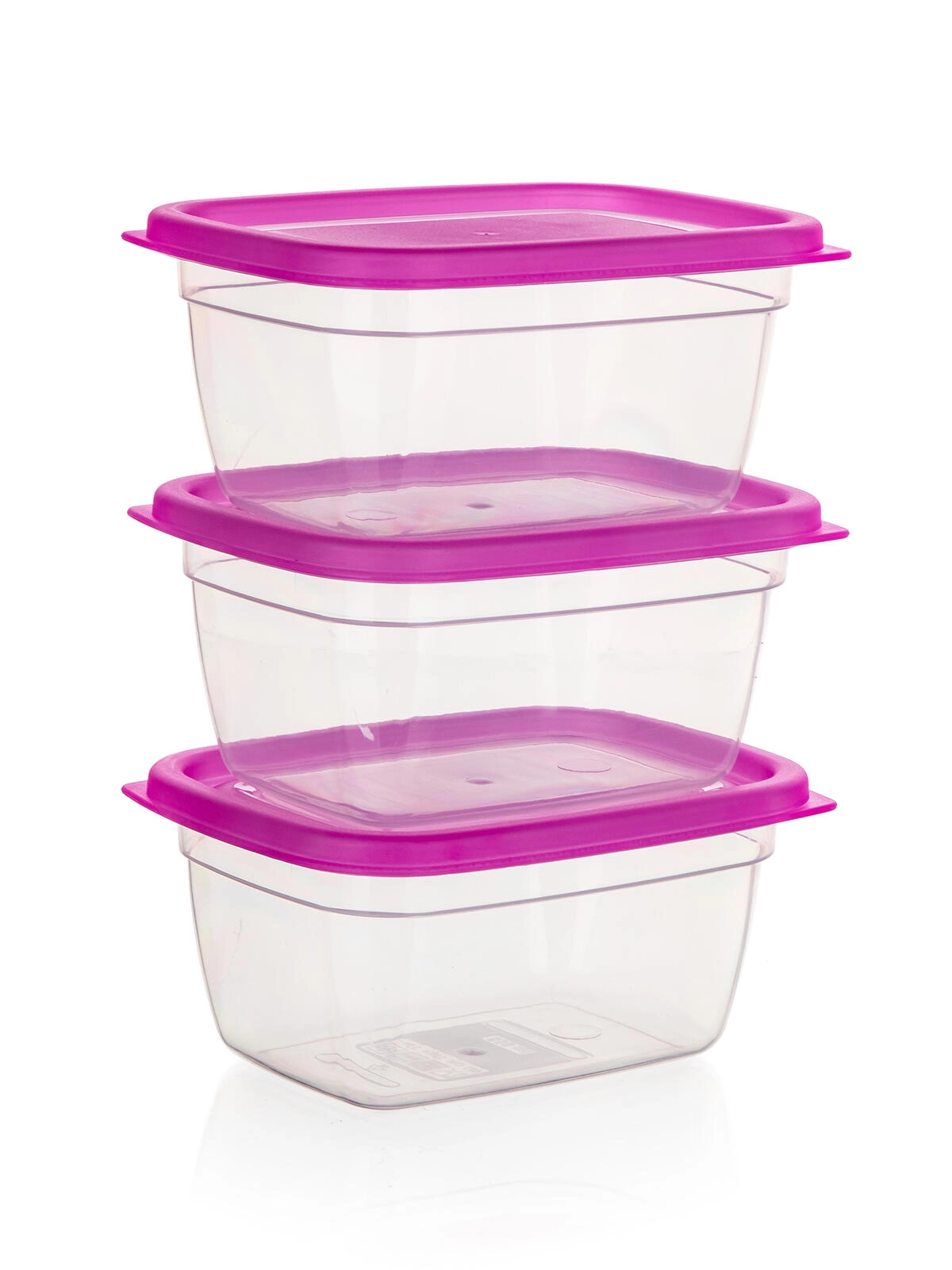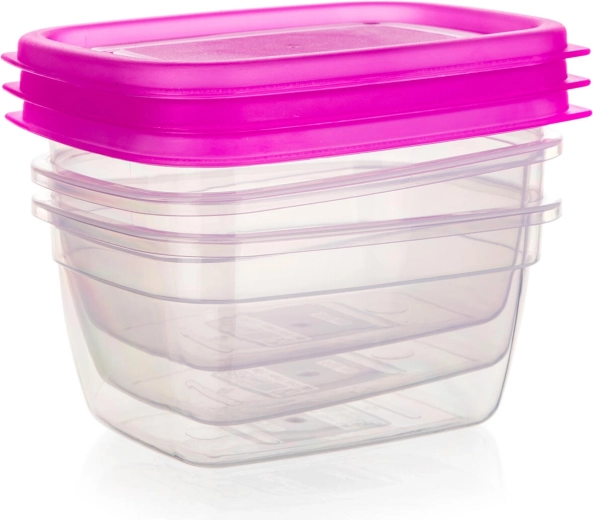 Pratique set de 3 boîtes en plastique d’un volume de 0,55 l pour le stockage quotidien des aliments. Les contenants transparents avec couvercles roses permettent de voir facilement le contenu, sont réutilisables, légers et conviennent à l’organisation du réfrigérateur et du garde-manger.