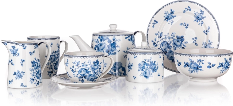 Créez un service de présentation Blue Flower assorti – théière, tasses, sucrier et d’autres pièces avec le même décor.