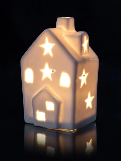 Élégante petite maison en porcelaine avec éclairage LED intégré, créant une ambiance agréable et chaleureuse dans tout intérieur. La lumière blanche vacillante imite fidèlement la flamme d’une bougie tout en étant sécurisée et économe en énergie. L’emballage comprend une ampoule LED et des piles, vous pouvez donc utiliser la décoration immédiatement.