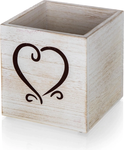 Une élégante boîte en bois avec patine blanche et motif de cœur apporte un charme rustique à votre intérieur. Elle convient parfaitement comme décoration, pot à crayons ou mini cache-pot pour fleurs séchées. Grâce à ses pieds de protection stables, elle préserve les surfaces et sa construction robuste assure une longue durée de vie.