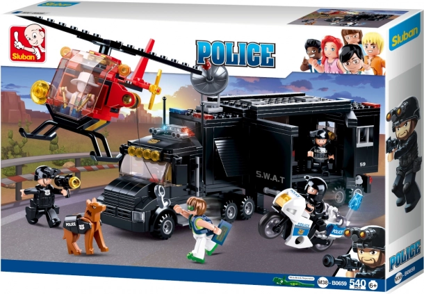 Cette maquette détaillée SLUBAN de la série policière SWAT offre aux enfants d’innombrables possibilités de jeu et de construction. Le rôle principal revient à la robuste base mobile – un camion noir riche en détails réalistes – complétée par un hélicoptère pour les interventions aériennes et une moto de police rapide pour la poursuite des voleurs. La boîte contient 5 figurines et de nombreux accessoires pour soutenir des histoires palpitantes et des scénarios créatifs.