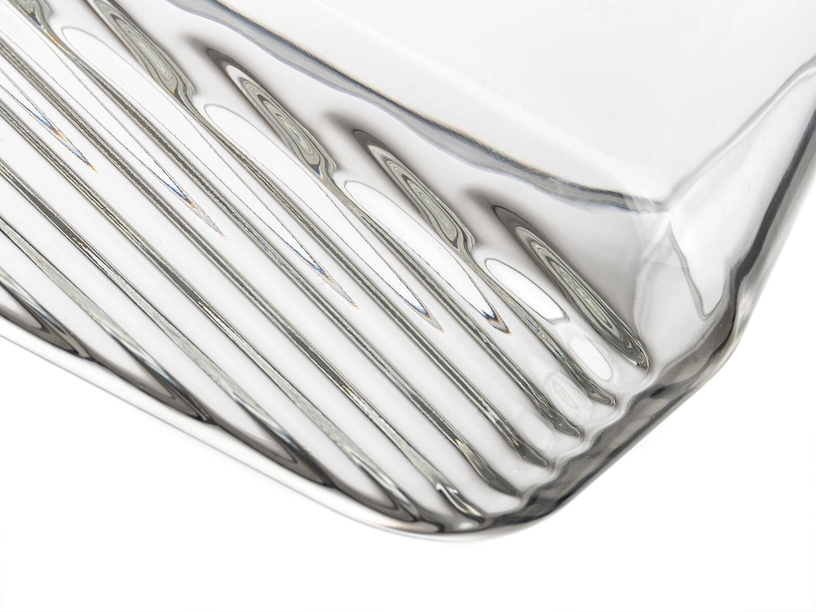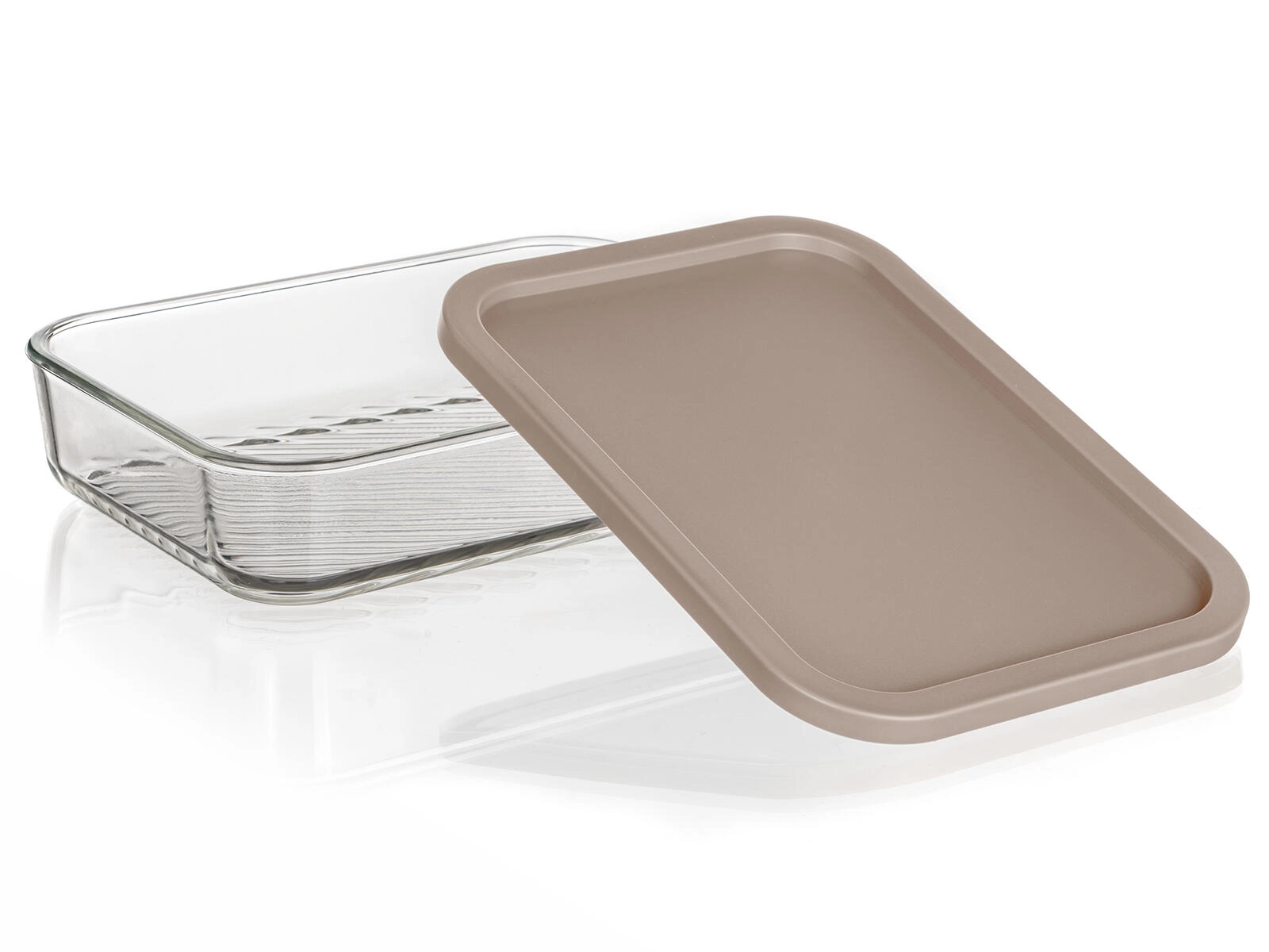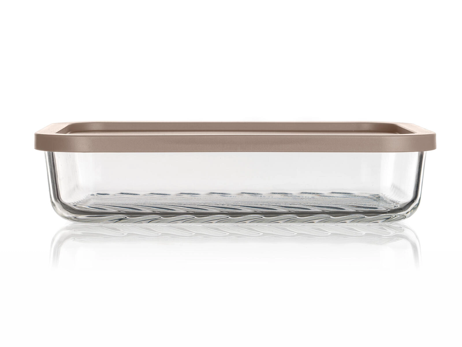 Le format rectangulaire 22,5 × 16 × 5 cm économise de la place au réfrigérateur et au congélateur. Le verre transparent avec fond rainuré améliore la stabilité et facilite la visibilité du contenu.