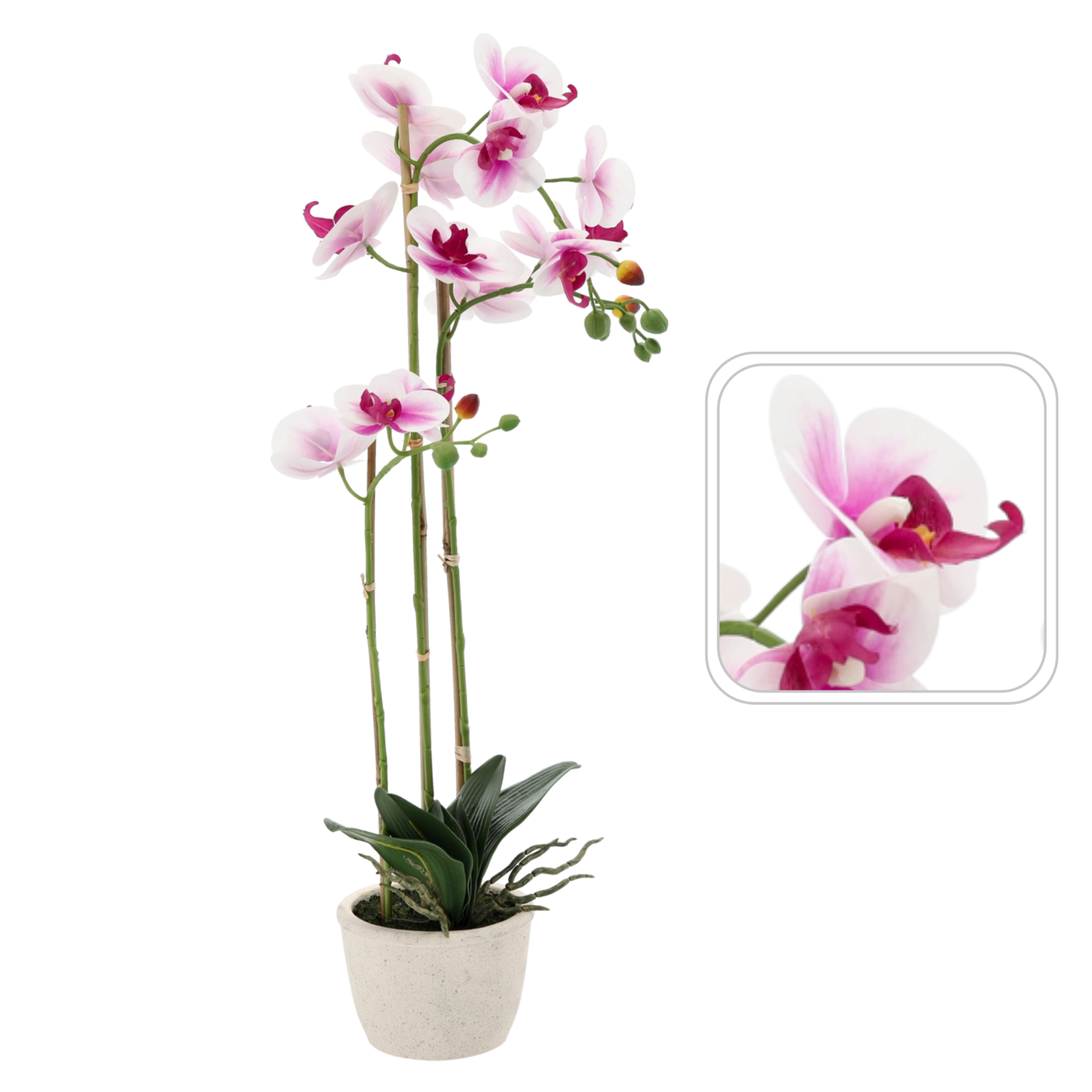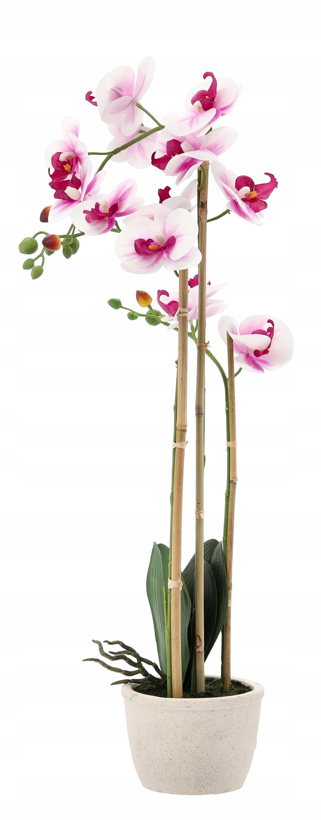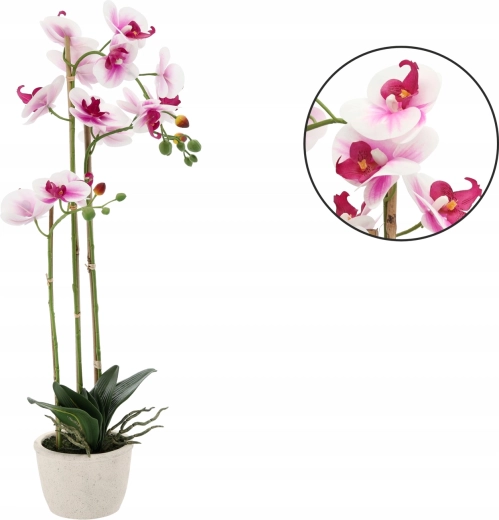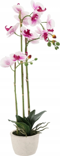 Cette élégante orchidée artificielle aux tons délicats blanc‑rose paraît très naturelle grâce au soin apporté aux détails des fleurs, bourgeons et feuilles. Sa hauteur de 70 cm est idéale pour les appuis de fenêtre, commodes ou salles de bain, où elle apporte fraîcheur et style sans besoin de lumière ni d’entretien régulier.