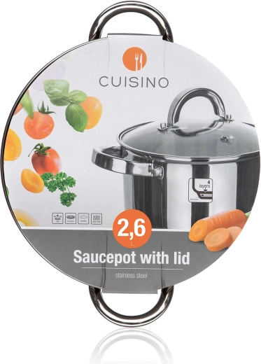 La casserole pratique en acier inoxydable CUISINO d’un volume de 2,6 l et d’un diamètre de 18 cm avec couvercle en verre est idéale pour la cuisine quotidienne. Elle offre une finition brillante à l’intérieur comme à l’extérieur, une jauge intérieure pour un dosage précis et des poignées en acier inoxydable robustes ainsi qu’un bouton. Compatible avec tous les types de tables de cuisson, elle deviendra un allié fiable dans votre cuisine.