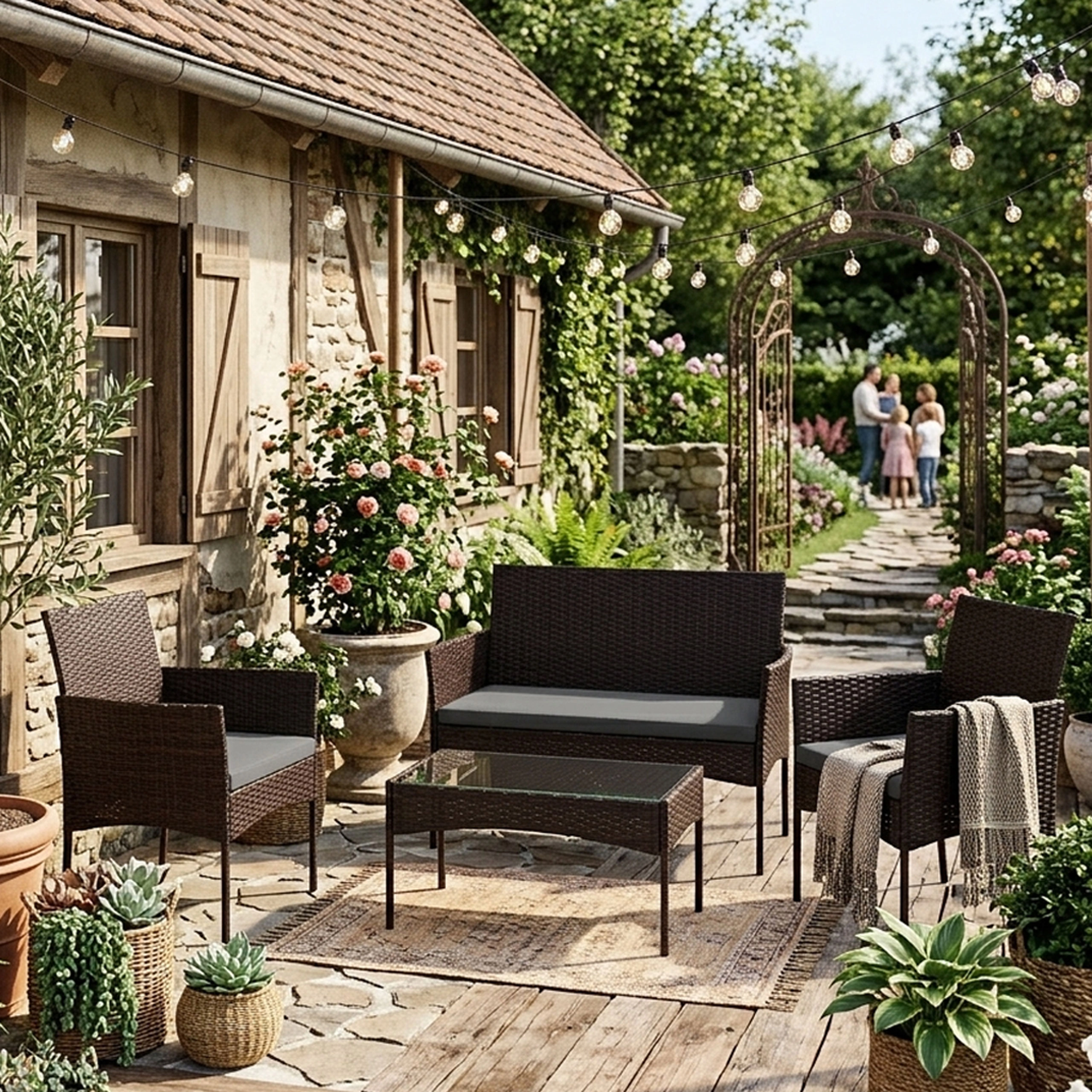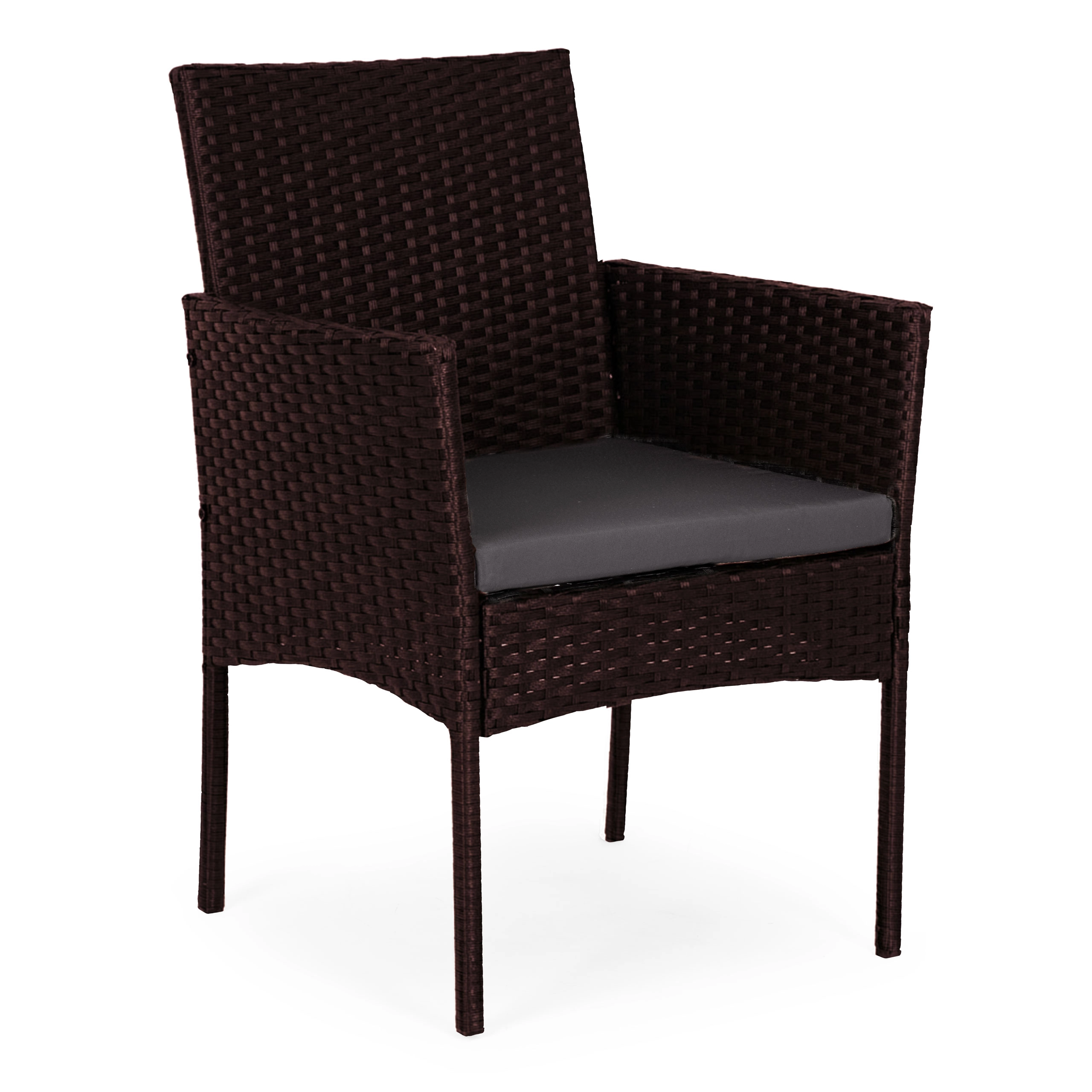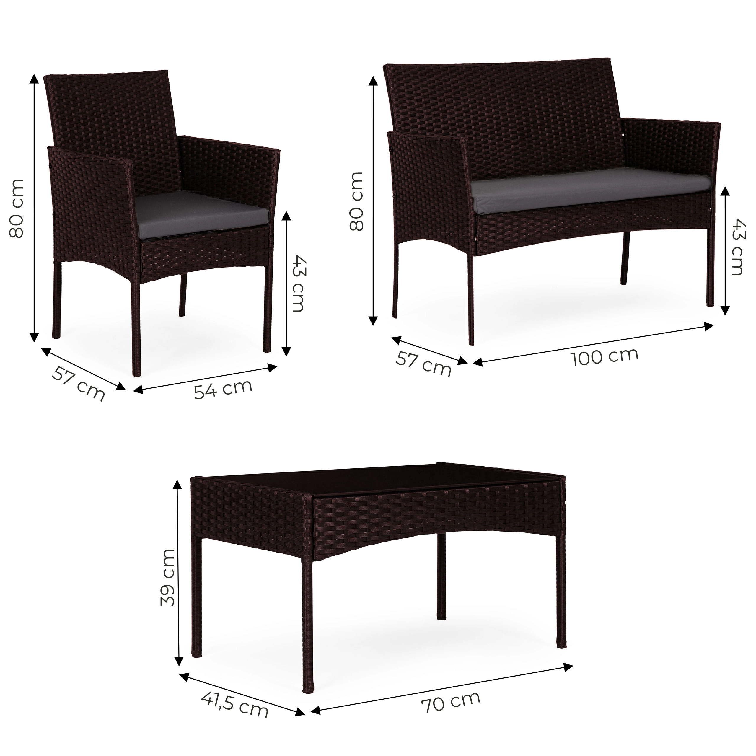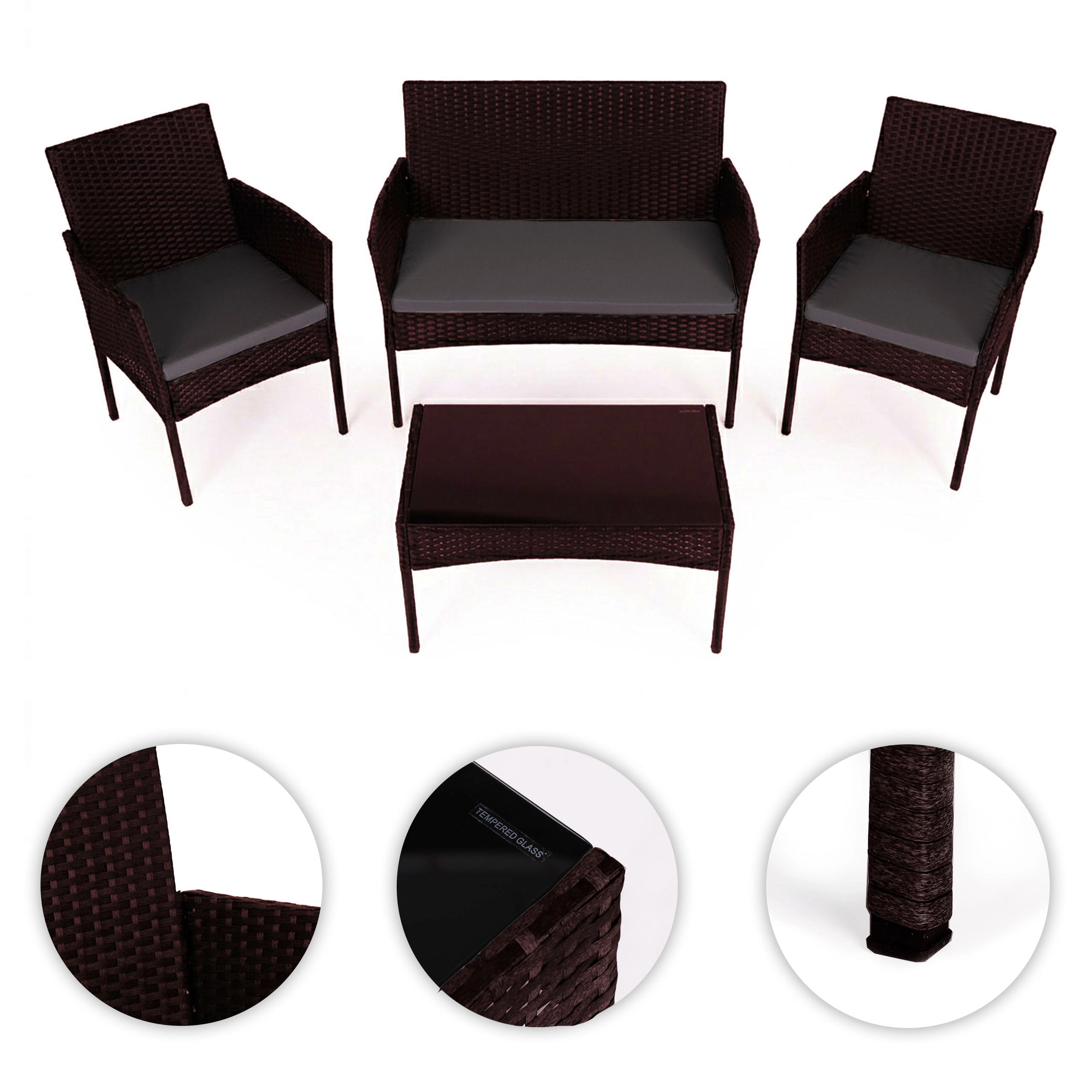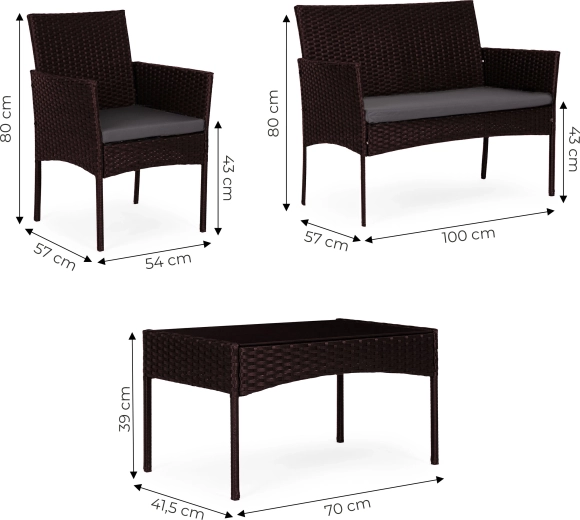 Élégant, l’ensemble de mobilier de jardin au look rotin brun foncé est idéal pour les moments en famille, les barbecues du week-end ou la détente en soirée. Il allie grande résistance et style intemporel – le rotin synthétique résiste aux UV et à l’humidité, l’armature en acier assure la solidité et le plateau en verre de la table apporte une touche légère et moderne.