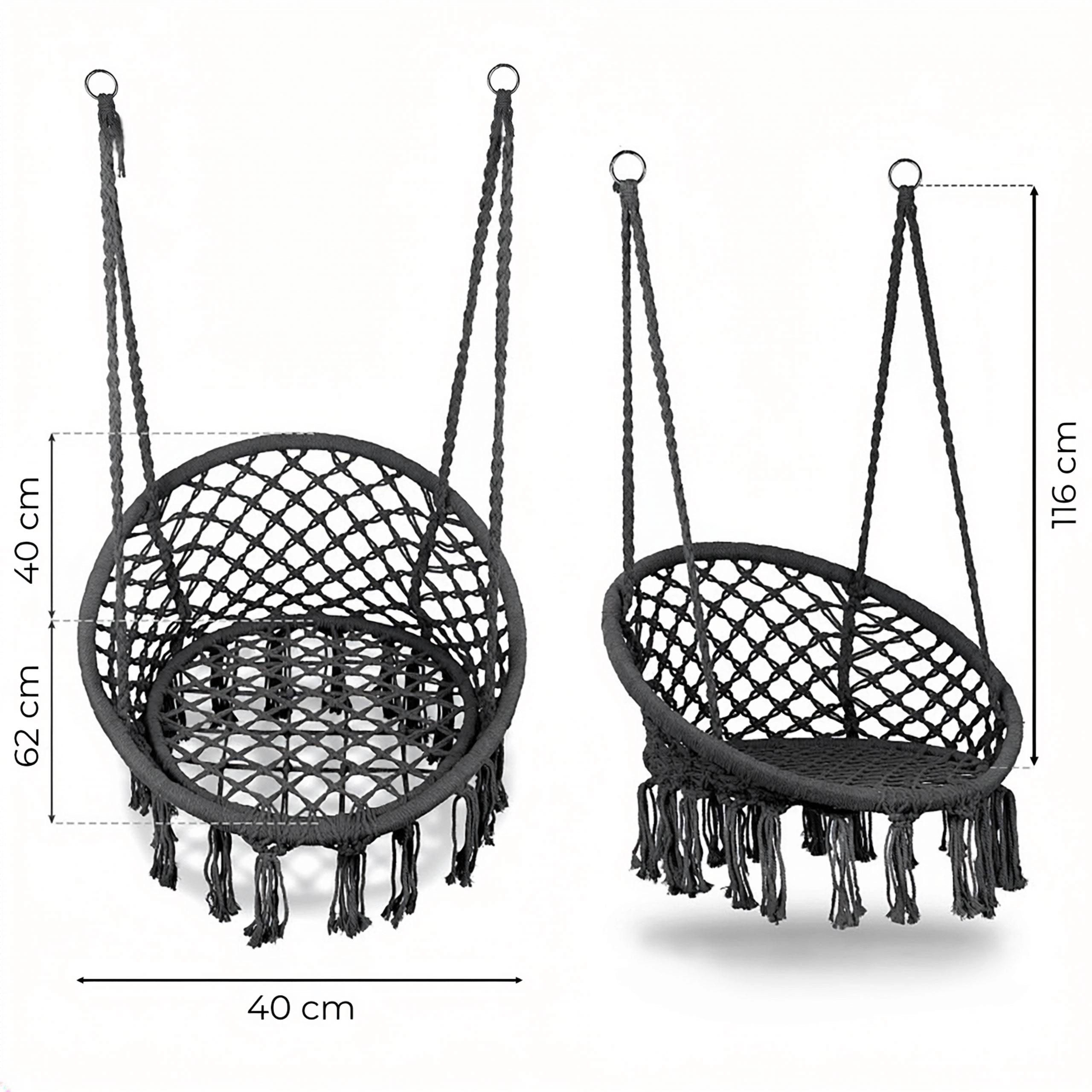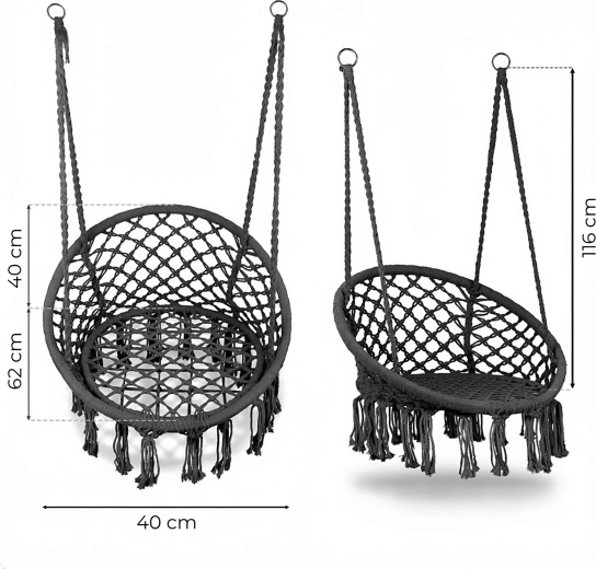 Le cadre circulaire en acier robuste avec un tressage en corde dense s’adapte au corps, offre un soutien agréable et résiste à une utilisation quotidienne. Les franges stylées apportent légèreté et caractère boho, rehaussant l’atmosphère de tout espace.