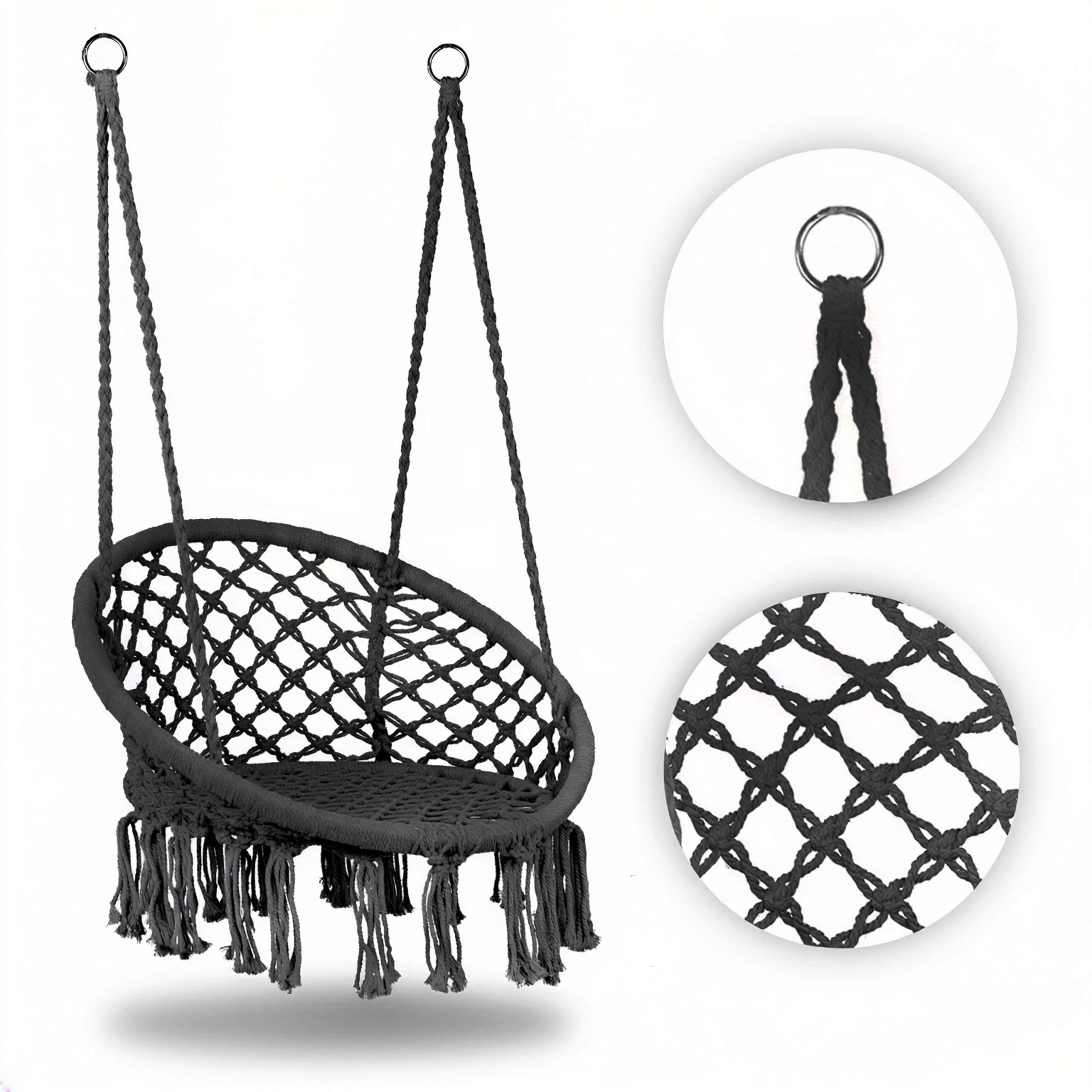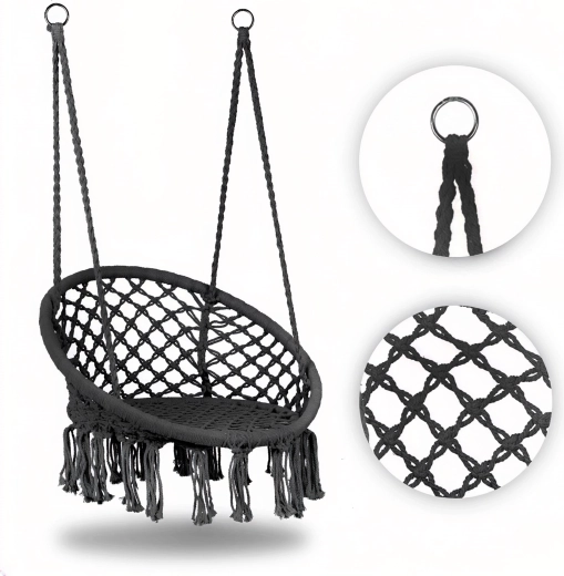 Le cadre circulaire en acier (22 mm) et le tressage dense en corde de 3 mm garantissent stabilité, soutien du corps et longue durée de vie en intérieur comme en extérieur.