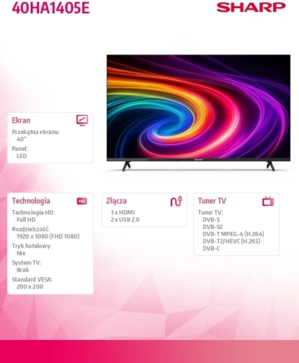 Le téléviseur LED 40" SHARP 40HA1405E, au style soigné, est un excellent choix pour le divertissement domestique au quotidien. Grâce à son cadre fin et à ses pieds en V élégants, il offre une allure épurée et moderne, tandis que l’image aux couleurs intenses et au contraste élevé garantit une immersion pour les films, le sport et les jeux.