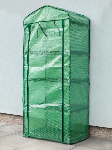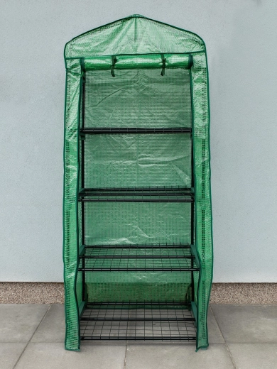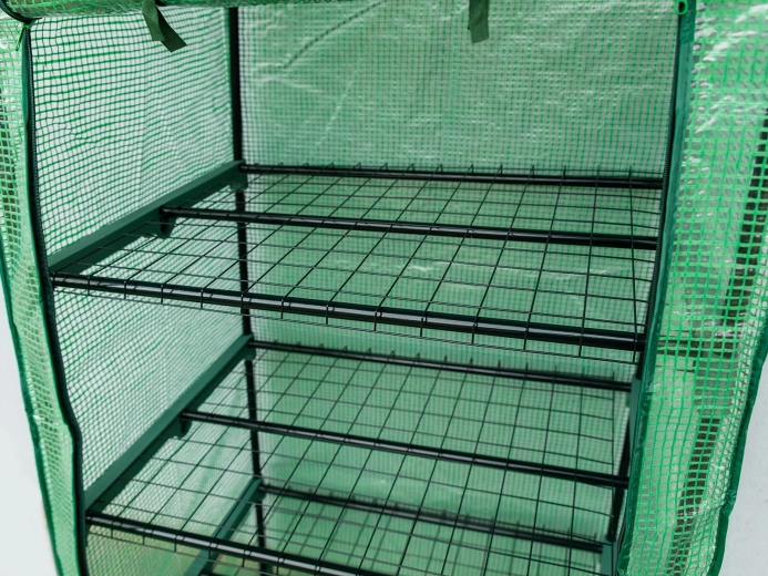 Quatre étagères métalliques filaires offrent un espace vertical organisé pour les semis, les herbes aromatiques et les petits pots. Grâce à sa structure élancée, la serre en film s’intègre même sur de petites surfaces et aide à utiliser efficacement chaque mètre carré.