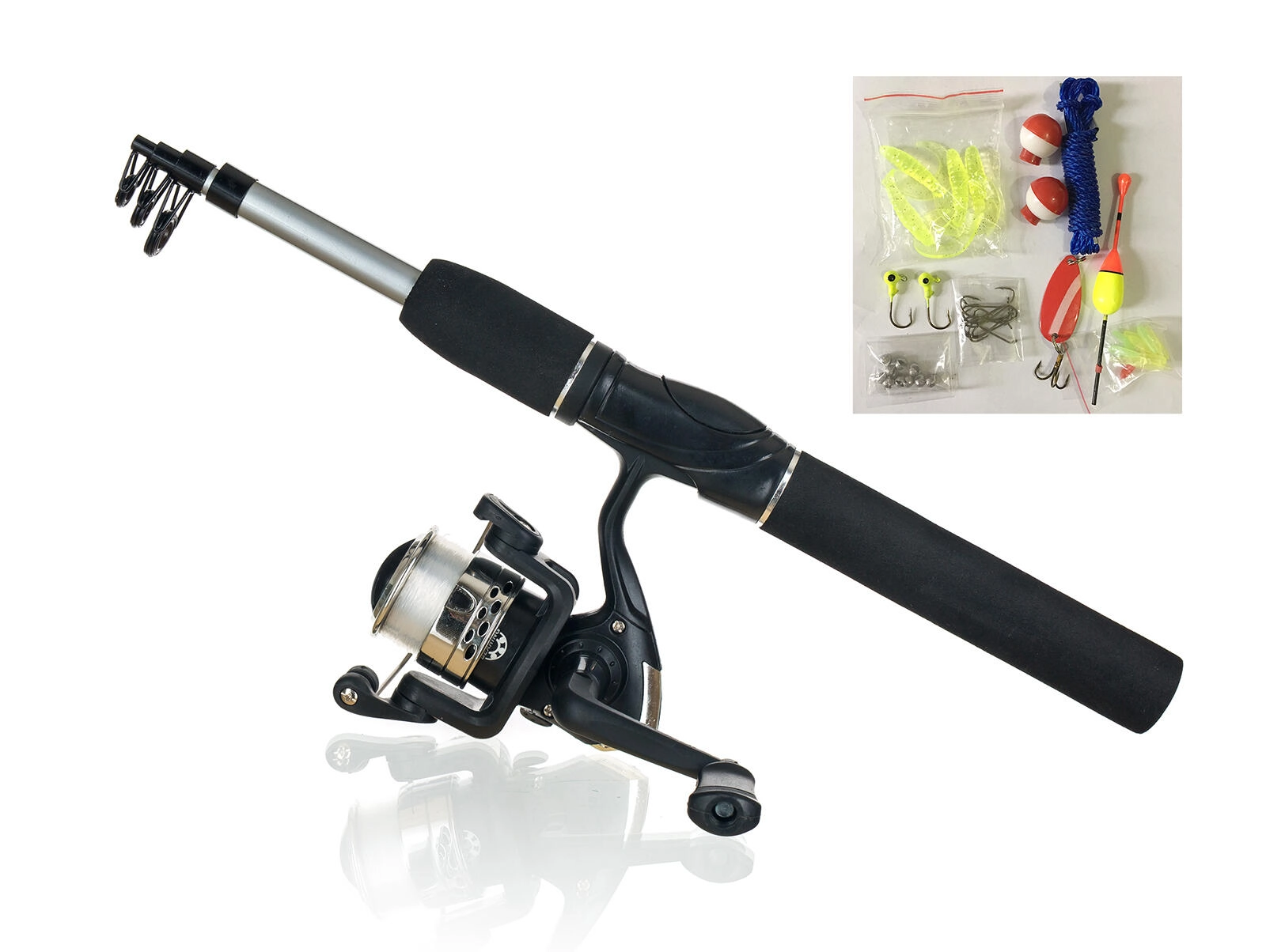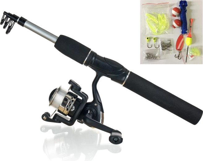 La canne se distingue par sa faible longueur de transport, se logeant facilement dans un sac à dos ou une voiture. L’emballage comprend également des accessoires pratiques – différents appâts, hameçons, flotteurs et plombs – pour partir immédiatement au bord de l’eau et vous adapter aux conditions du moment.