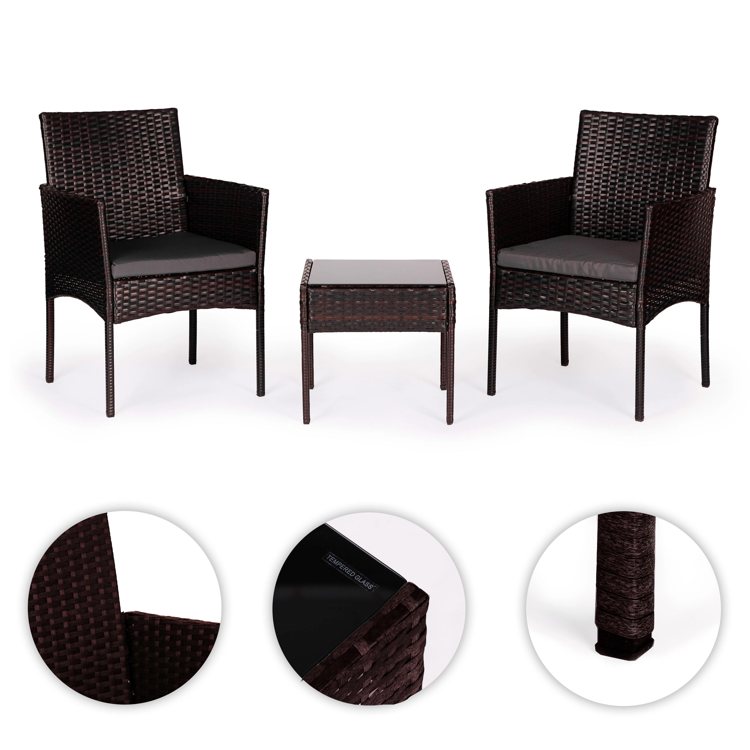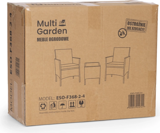 Un ensemble de jardin élégant pour 2 personnes de MultiGardenrésine tressée (technorattan), une structure en acier robuste et une table avec plateau en verre trempé. Livré avec des coussins rembourrés en polyester 160 g/m². Le mobilier est résistant aux intempéries, facile à entretenir et idéal pour la terrasse, le balcon et le jardin.