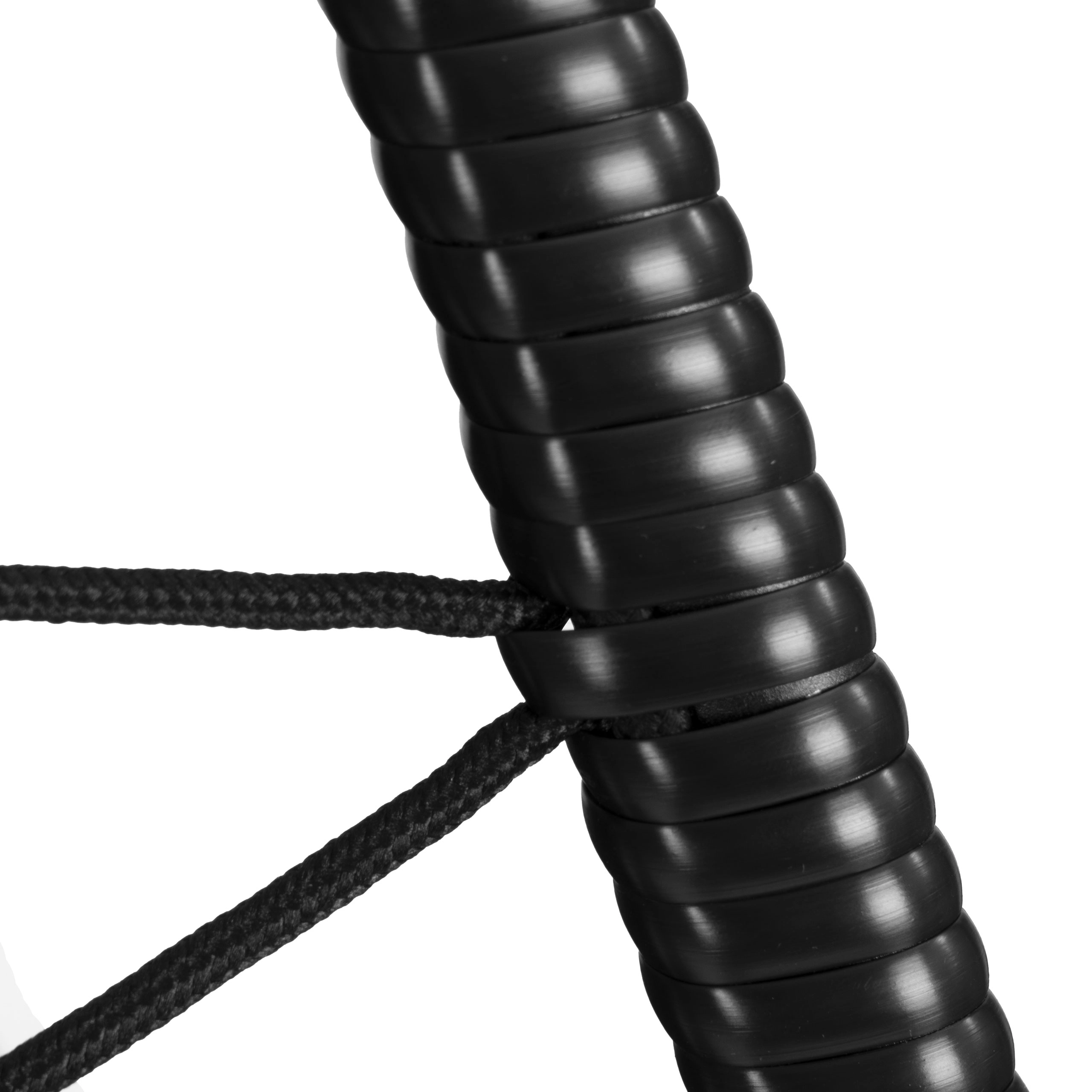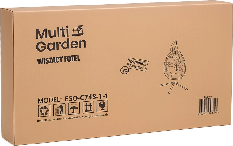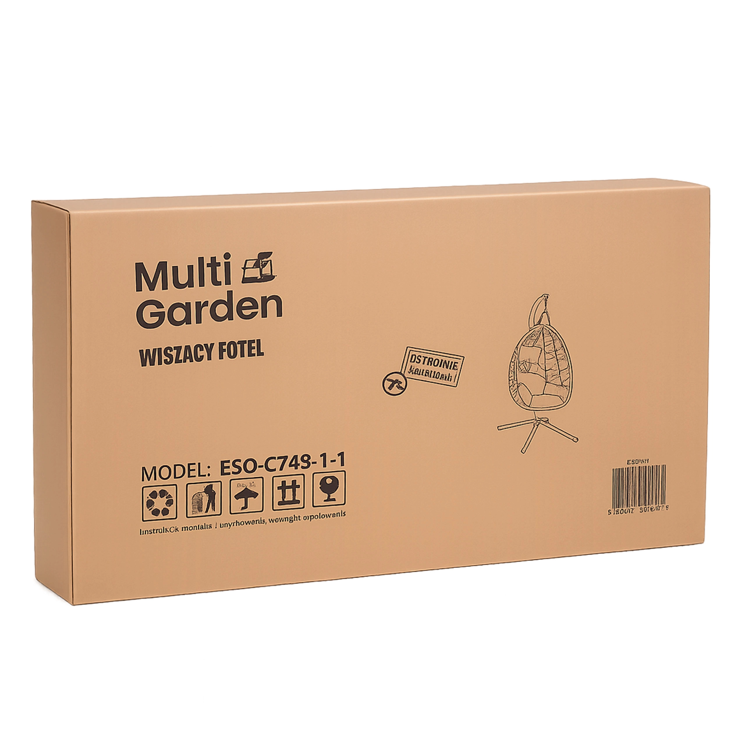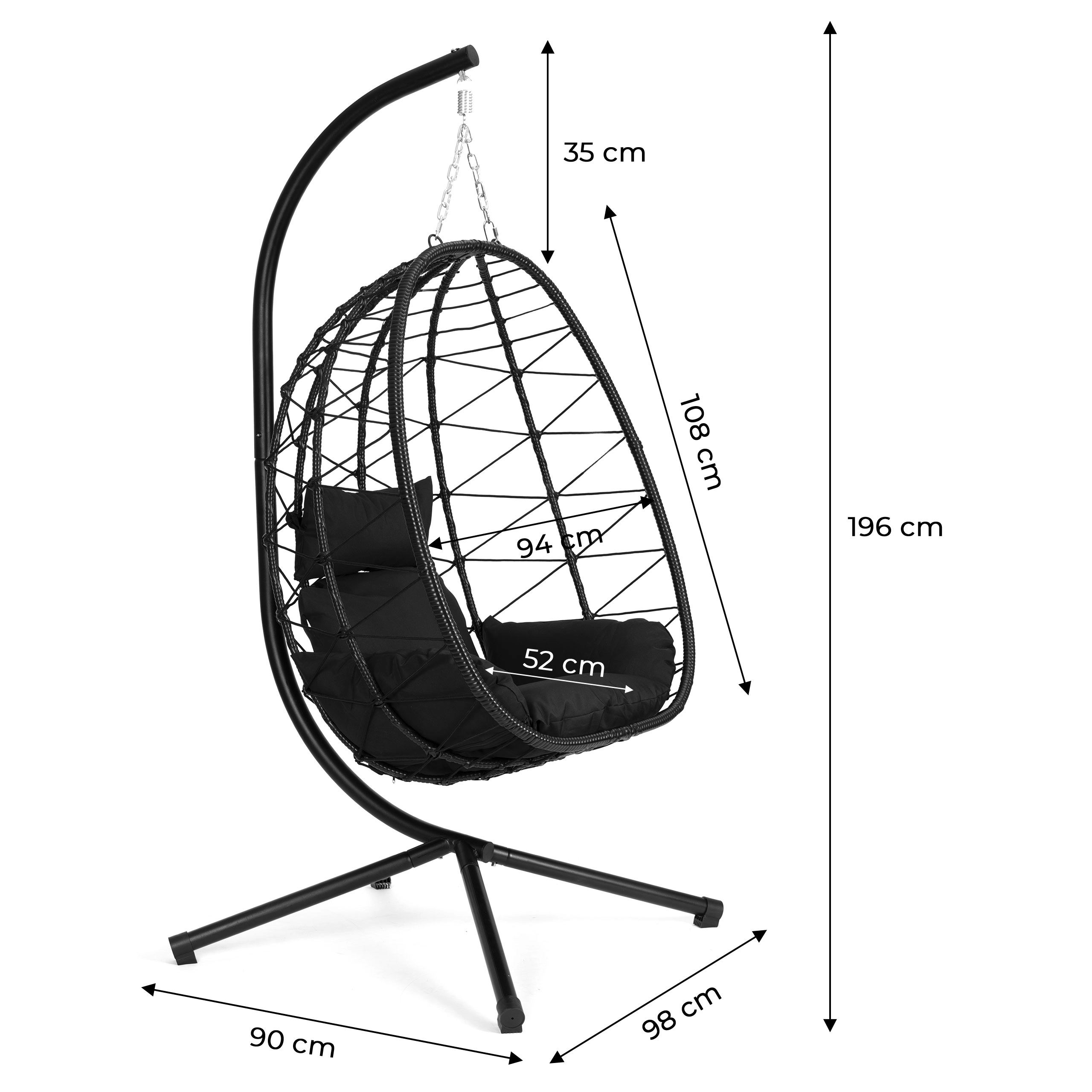 Le cadre en acier robuste enveloppé de technorattan est résistant aux UV, à l’humidité et aux conditions météorologiques changeantes. La chaîne avec ressort garantit un balancement fluide et silencieux et réduit les contraintes sur la structure. La base à quatre pieds avec embouts antidérapants reste stable même sur des surfaces moins régulières et protège le sol contre les rayures.