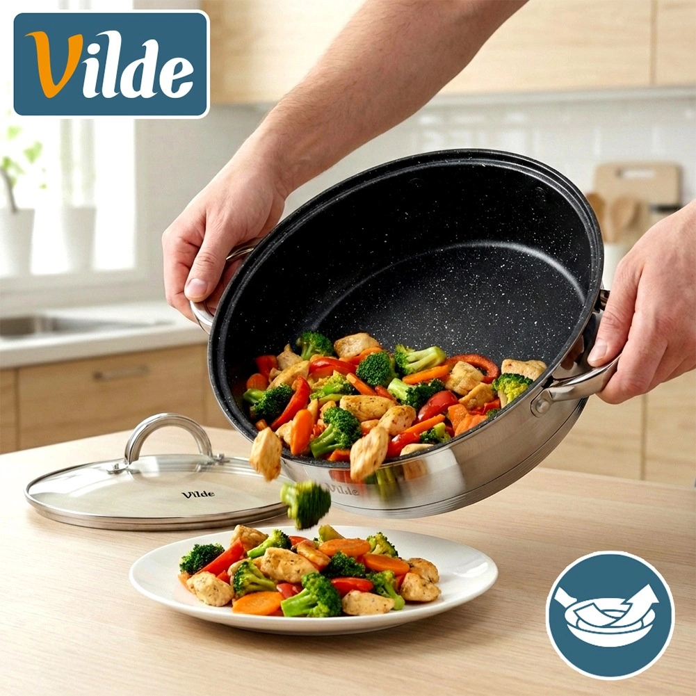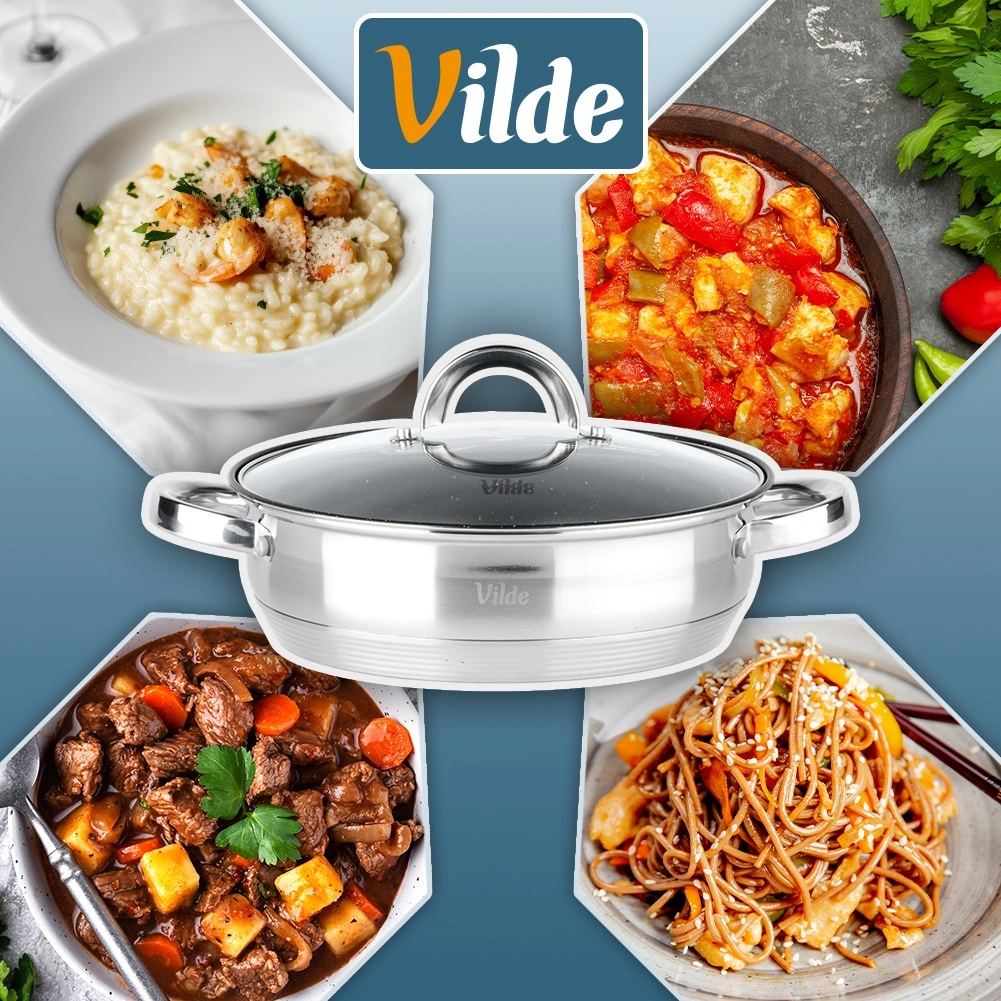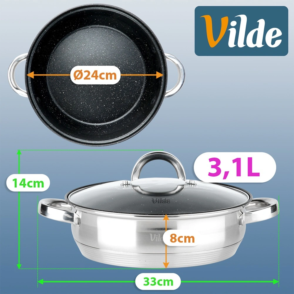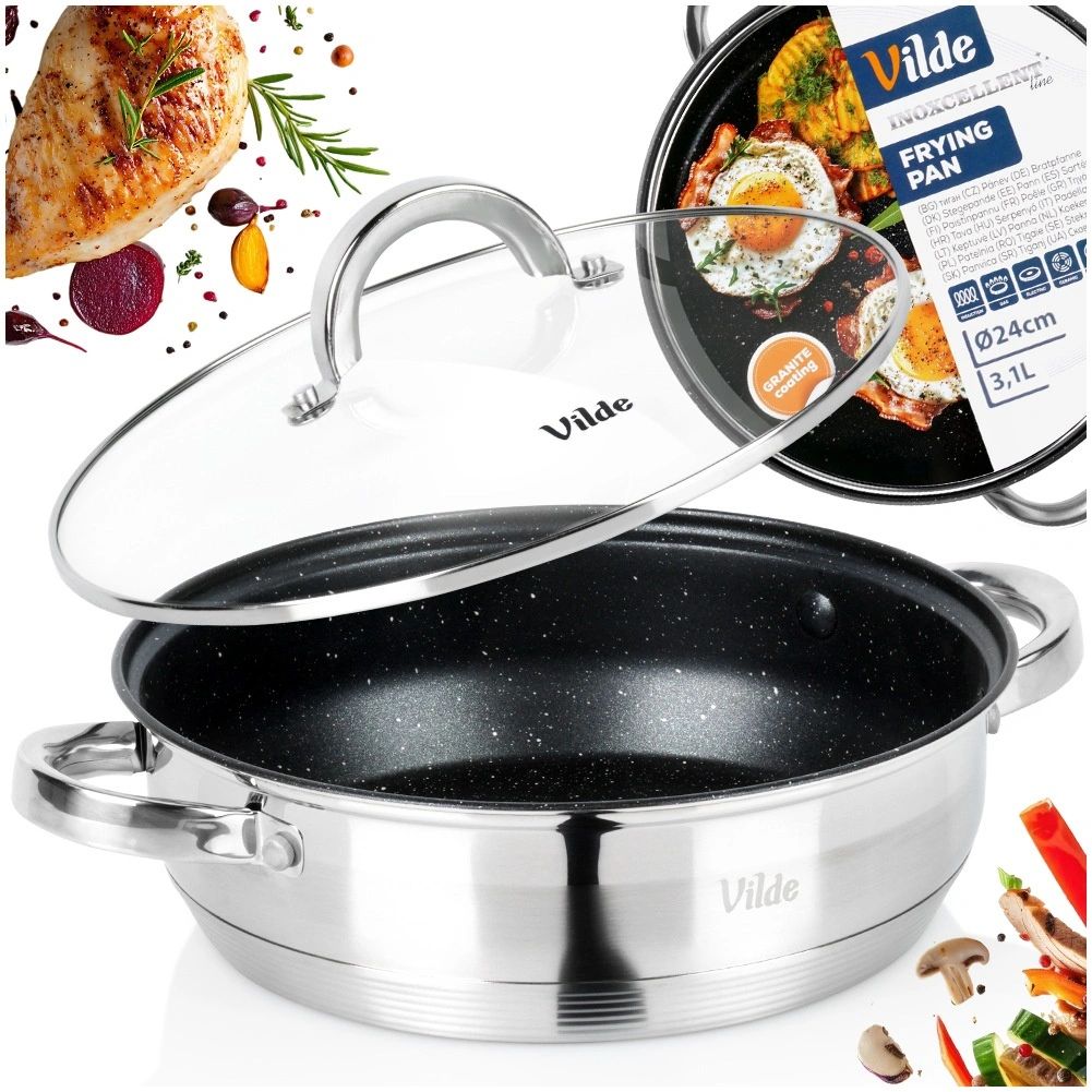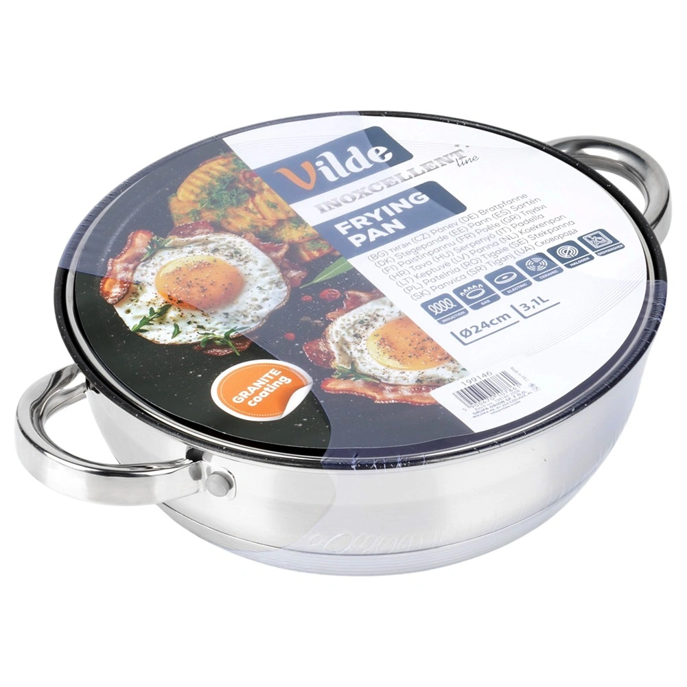 L’intérieur de la poêle est doté d’un revêtement antiadhésif résistant à effet granit, l’extérieur combine finitions mate et hautement polie. Le produit répond aux normes européennes de qualité. Produit original de la marque Vilde, ligne INOXCELLENT.
