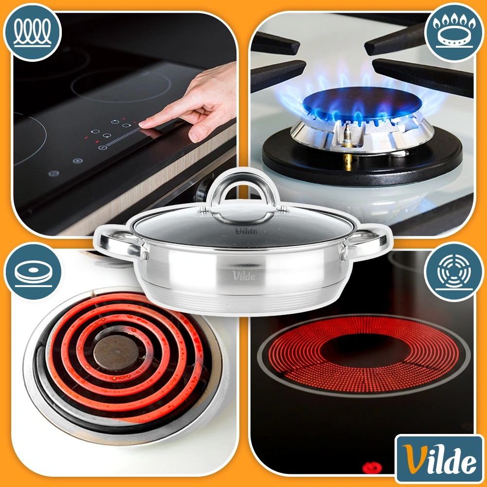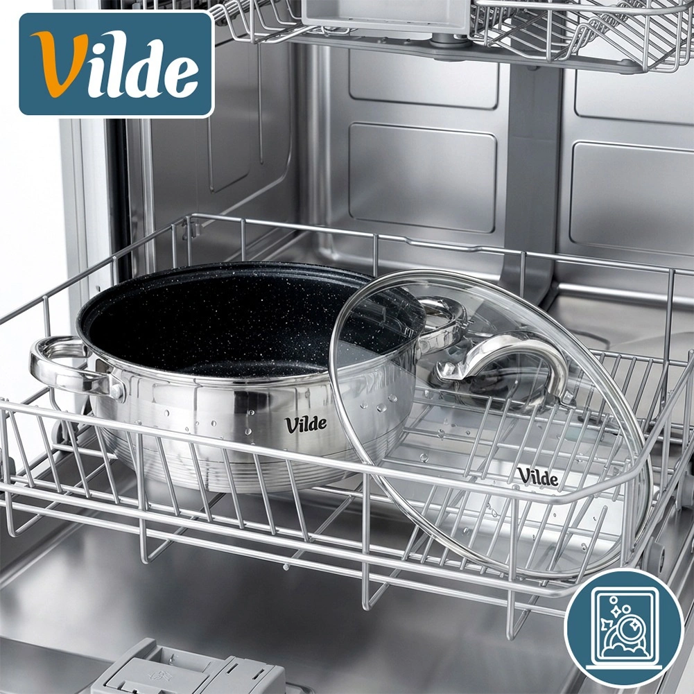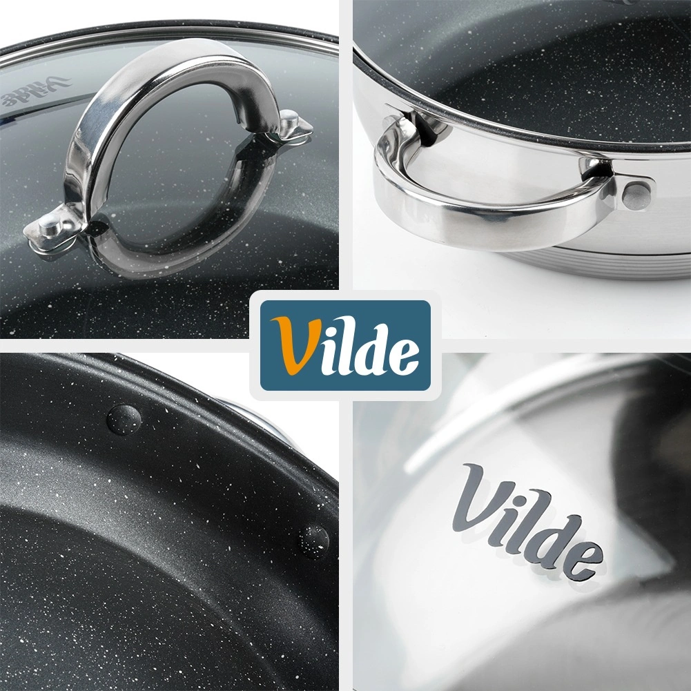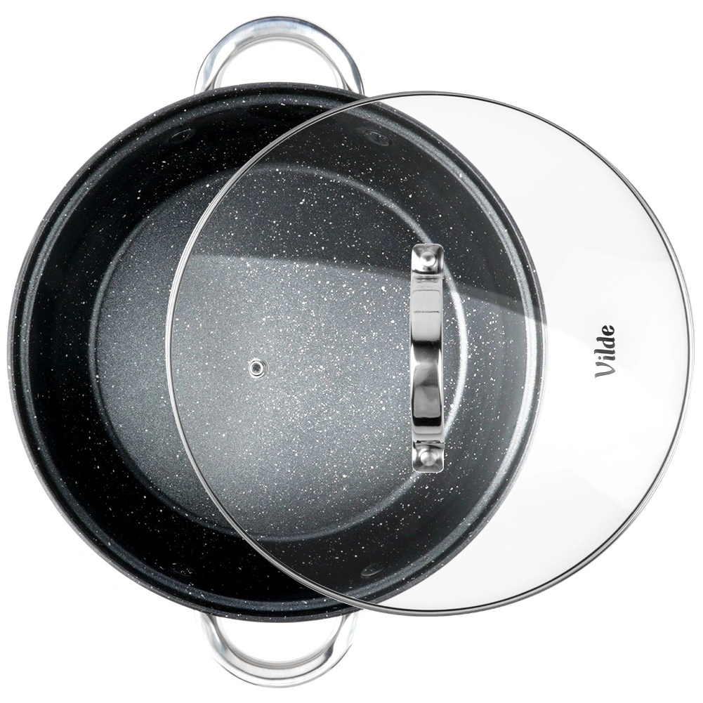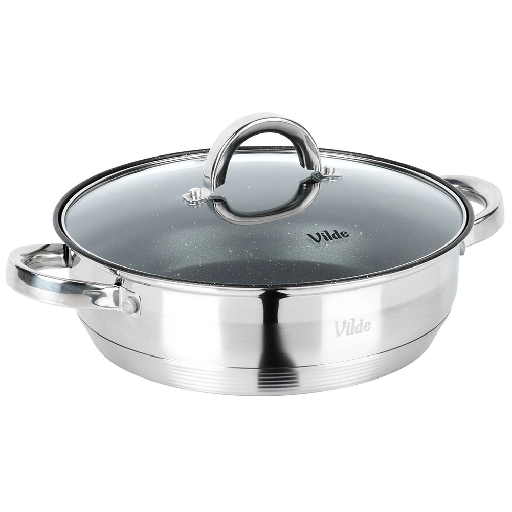L’intérieur de la poêle est doté d’un revêtement antiadhésif résistant à effet granit, l’extérieur combine finitions mate et hautement polie. Le produit répond aux normes européennes de qualité. Produit original de la marque Vilde, ligne INOXCELLENT.