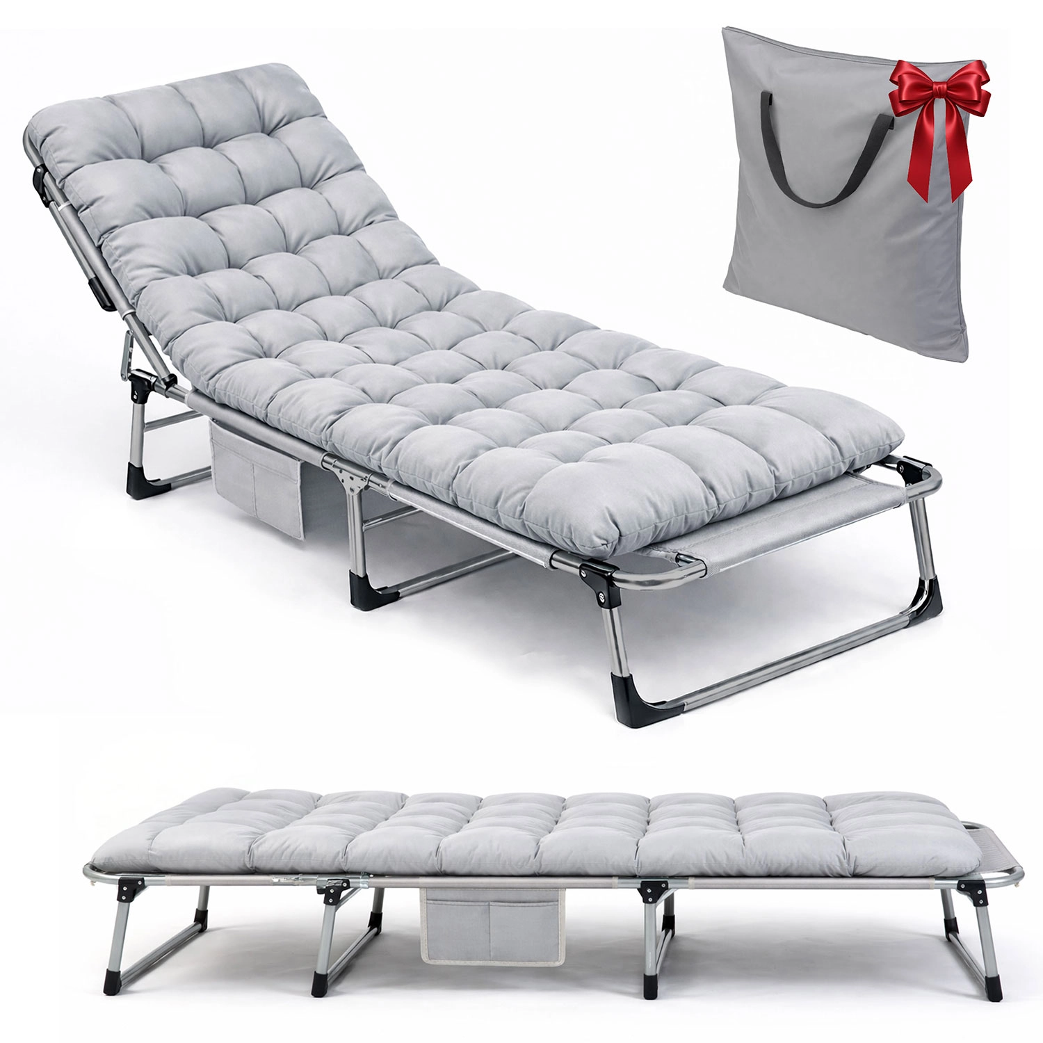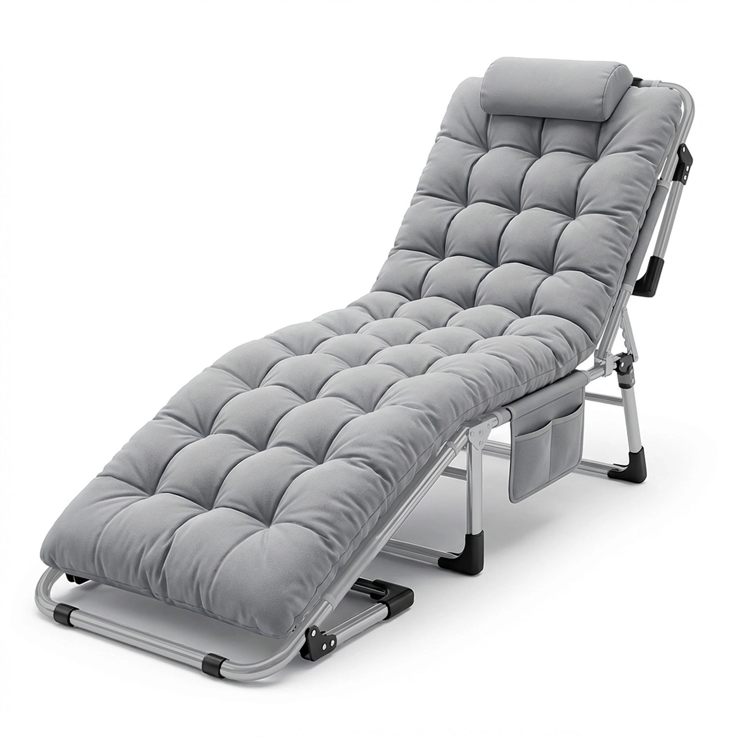 Grâce au cadre métallique et aux embouts antidérapants des pieds, le transat est stable et durable pour une utilisation en extérieur. Le matelas épais et moelleux avec appui-tête reste gonflant et confortable même en cas d’usage fréquent. Une poche latérale pratique garde téléphone, livre ou bouteille à portée de main. Une fois replié, le transat est compact, sécurisé par des sangles à velcro et rangé dans le sac de transport.